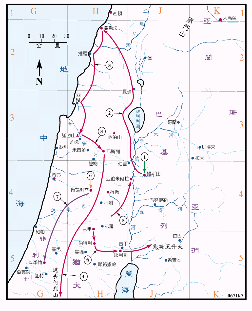 8. 王下 2:1-13 以利亚和他的门徒以利沙从吉甲经伯特利、耶利哥到约但河东,他乘旋风升天。