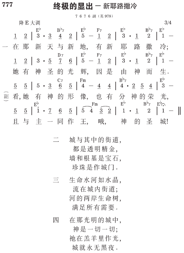 除此以外,新耶路撒冷将是经过过程、终极完成之三一神的终极显出,使祂在永世里,在得重生、变化、并得荣的人性里得着彰显(新约总论第八册,一六六页)。