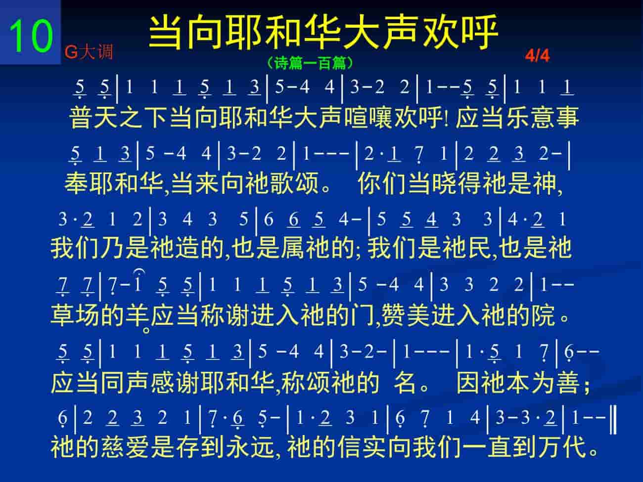 普天之下当向耶和华大声喧嚷欢呼!应当乐意事奉耶和华,当来向祂歌颂。你们当晓得祂是神,我们乃是祂造的,也是属祂的;我们是祂民,也是祂草场的羊。应当称谢进入祂的门,赞美进入祂的院。应当同声感谢耶和华,称颂祂的名。因祂本为善;祂的慈爱是存到永远,祂的信实向我们一直到万代。