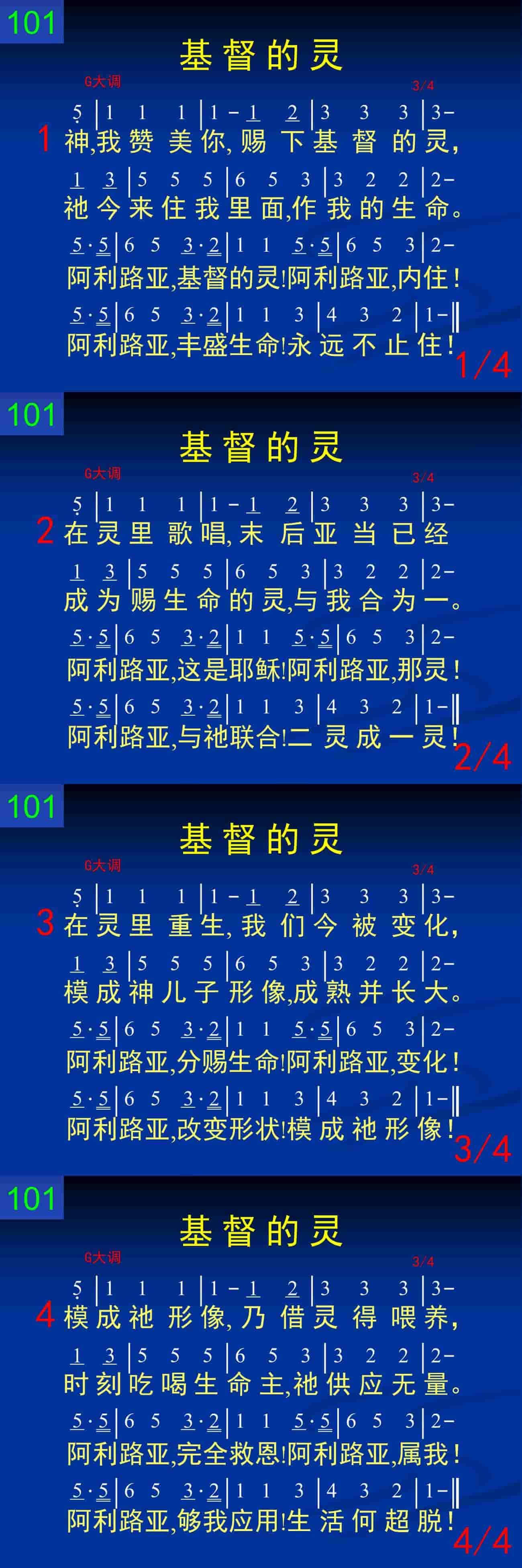 神,我赞美你,赐下基督的灵,祂今来住我里面,作我的生命。阿利路亚,基督的灵!阿利路亚,内住!阿利路亚,丰盛生命!永远不止住!
