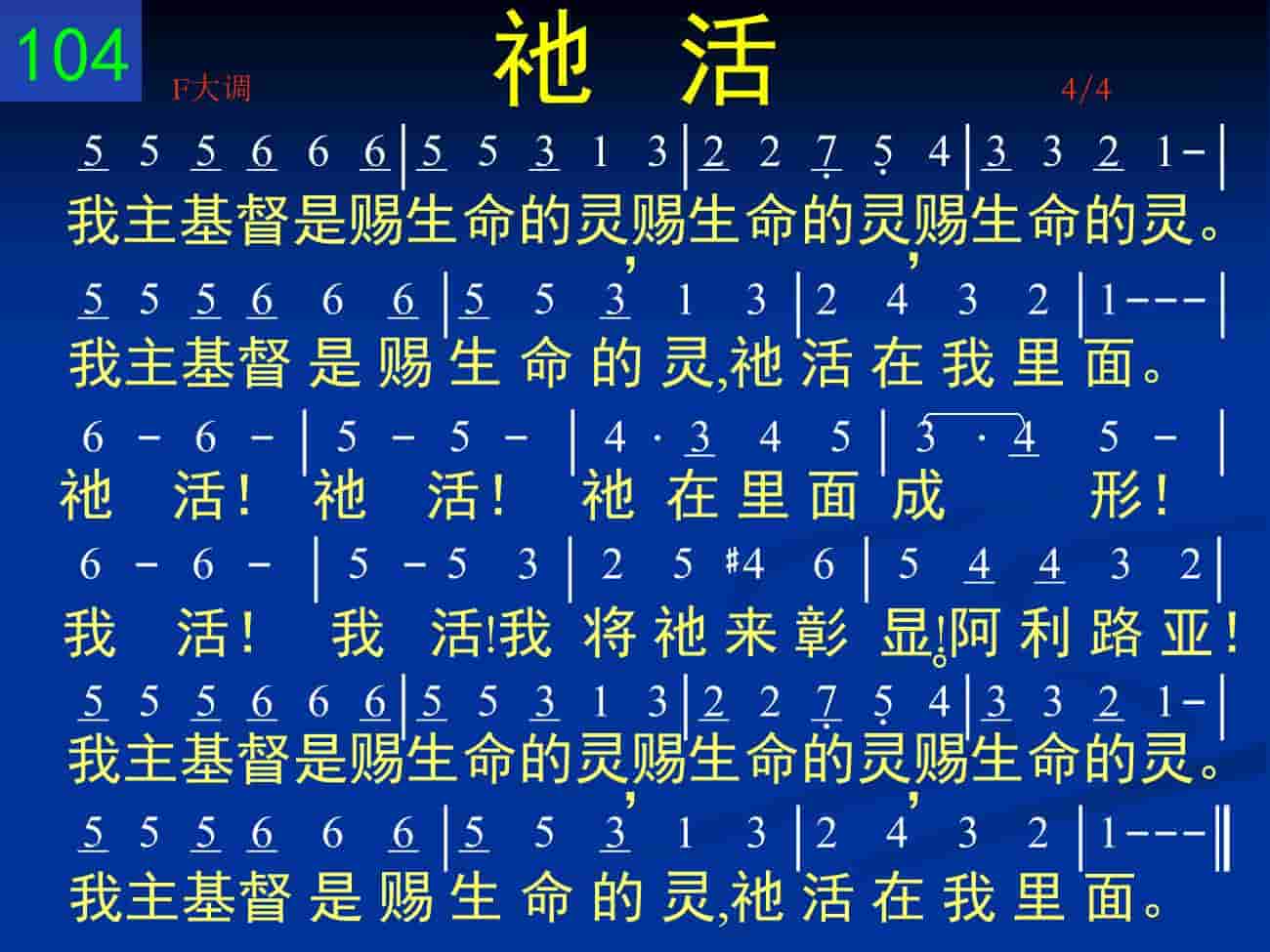 我主基督是赐生命的灵,赐生命的灵,赐生命的灵。我主基督是赐生命的灵,祂活在我里面。祂活!祂活!祂在里面成形!我活!我活!我将祂来彰显!阿利路亚!我主基督是赐生命的灵,赐生命的灵,赐生命的灵。我主基督是赐生命的灵,祂活在我里面。