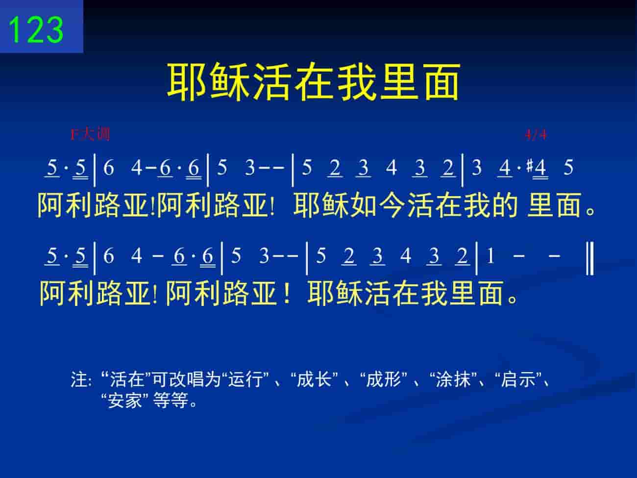 阿利路亚!阿利路亚!耶稣如今活在我的里面。阿利路亚!阿利路亚!耶稣活在我里面。