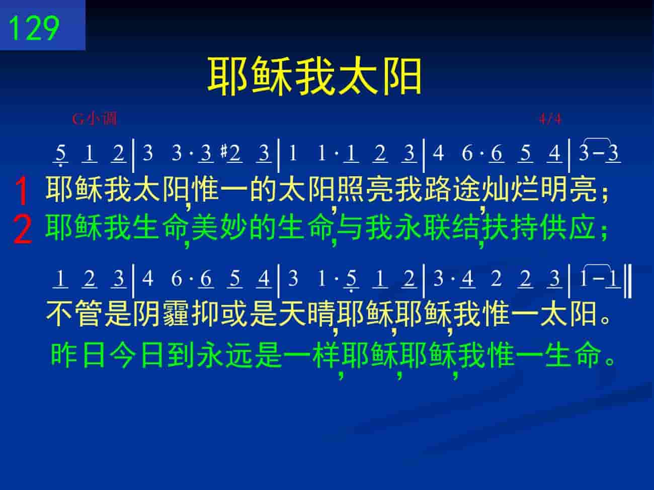 耶稣我太阳,唯一的太阳,照亮我路途,灿烂明亮;不管是阴霾抑或是天晴,耶稣,耶稣,我唯一太阳。