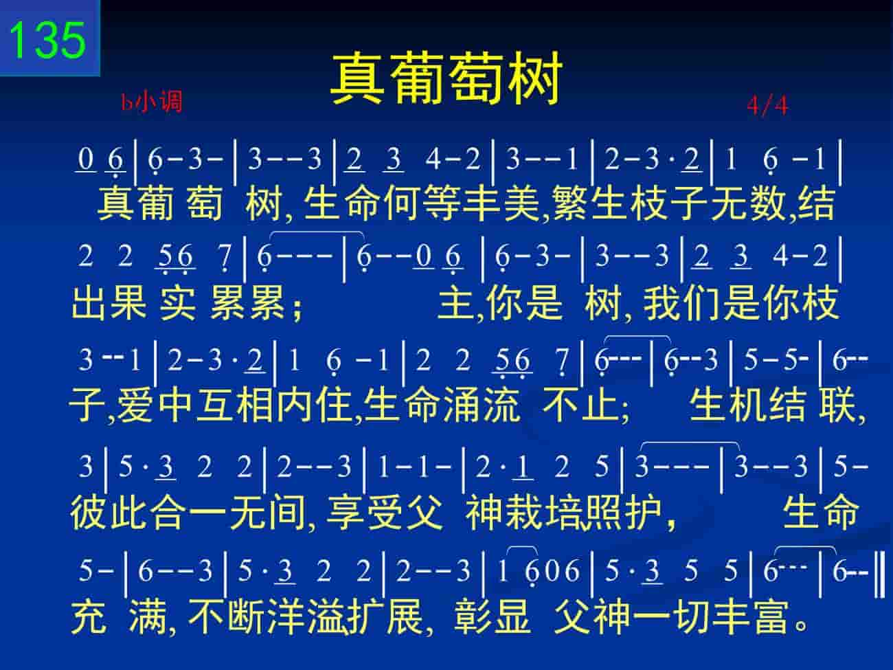 真葡萄树,生命何等丰美,繁生枝子无数,结出果实累累;主,你是树,我们是你枝子,爱中互相内住,生命涌流不止;生机结联,彼此合一无间,享受父神栽培、照护,生命充满,不断洋溢、扩展,彰显父神一切丰富。