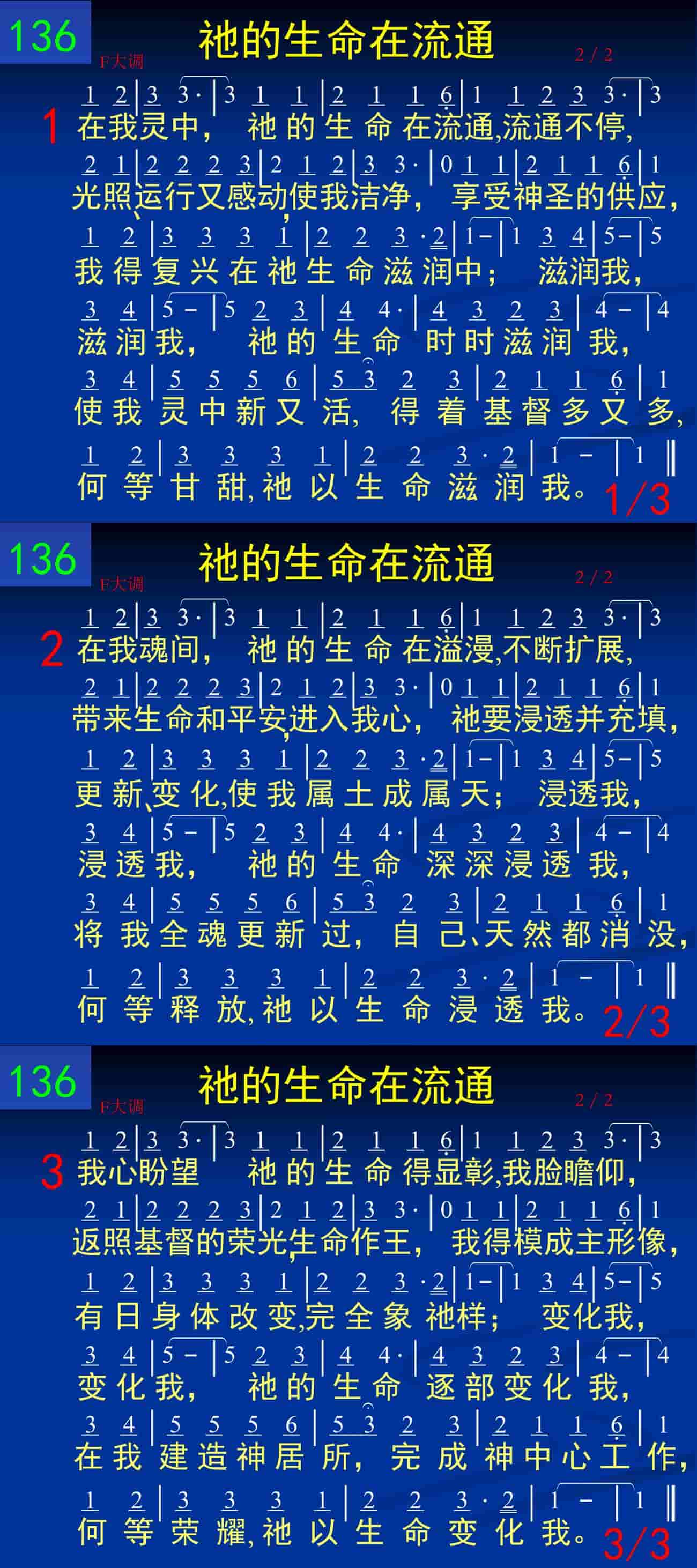 在我灵中,祂的生命在流通,流通不停,光照、运行又感动,使我洁净,享受神圣的供应,我得复兴在祂生命滋润中;滋润我,滋润我,祂的生命时时滋润我,使我灵中新又活,得着基督多又多,何等甘甜,祂以生命滋润我。