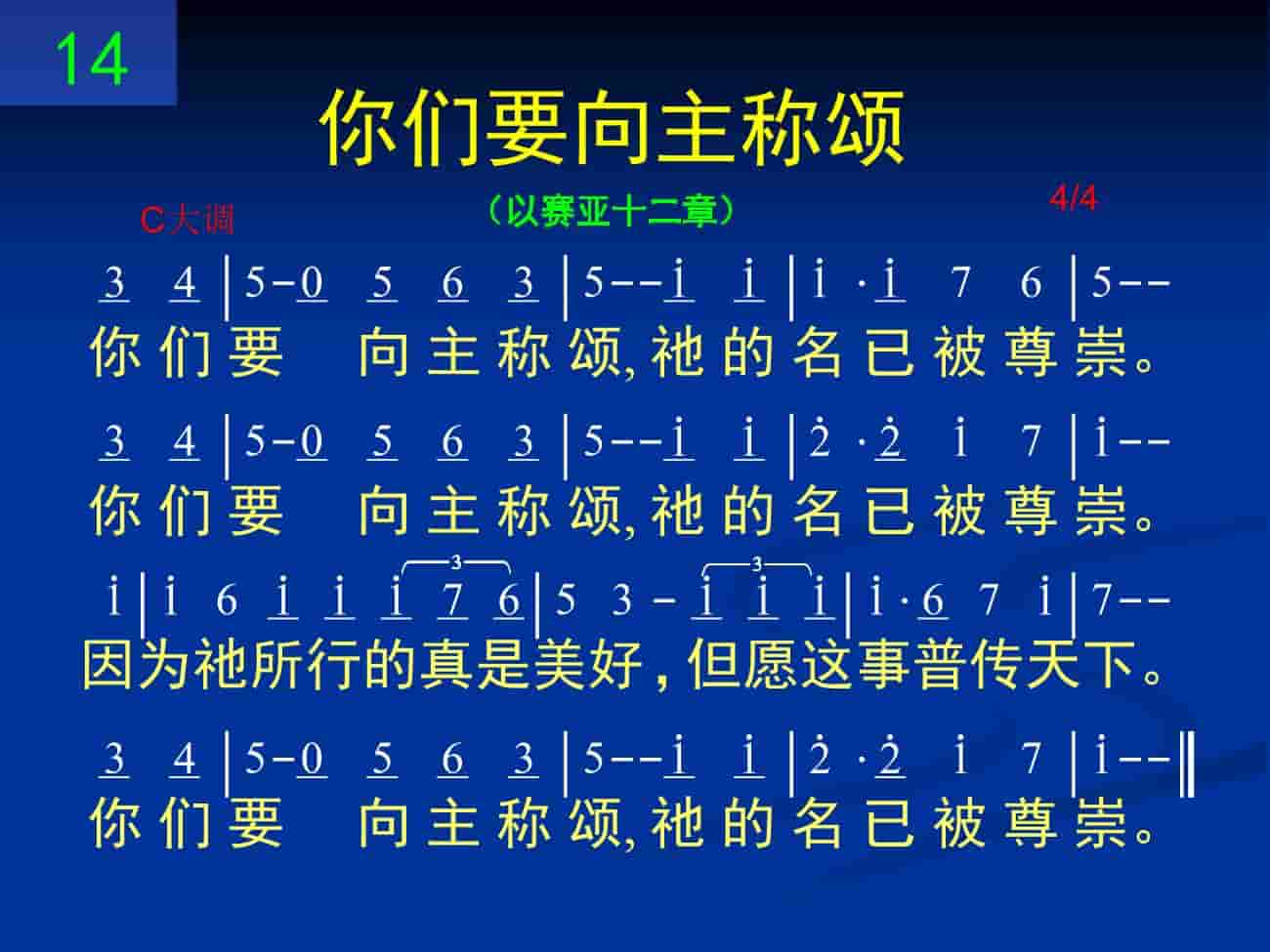 你们要向主称颂,祂的名已被尊崇。你们要向主称颂,祂的名已被尊崇。因为祂所行的真是美好,但愿这事普传天下。你们要向主称颂,祂的名已被尊崇。