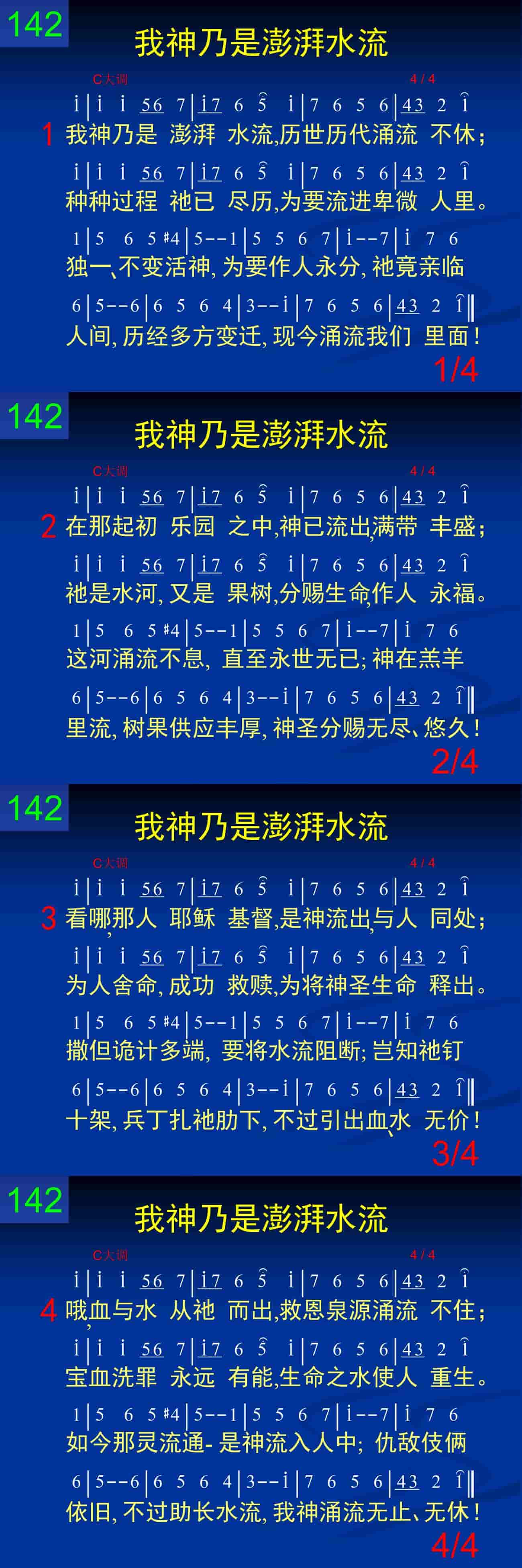 我神乃是澎湃水流,历世历代涌流不休;种种过程祂已尽历,为要流进卑微人里。独一不变活神,为要作人永分,祂竟亲临人间,历经多方变迁,现今涌流我们里面!