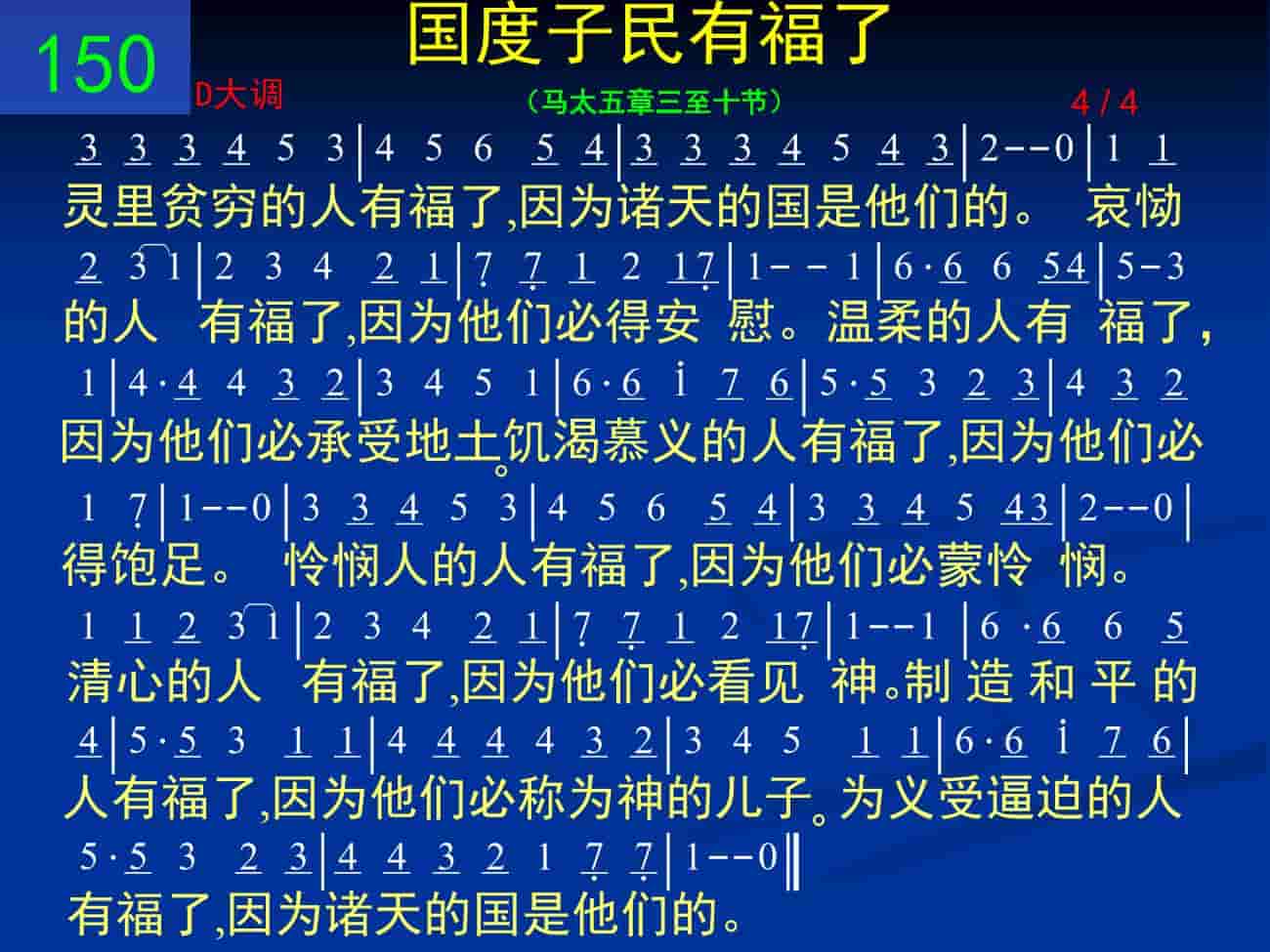 灵里贫穷的人有福了,因为诸天的国是他们的。哀恸的人有福了,因为他们必得安慰。温柔的人有福了,因为他们必承受地土。饥渴慕义的人有福了,因为他们必得饱足。怜悯人的人有福了,因为他们必蒙怜悯。清心的人有福了,因为他们必看见神。制造和平的人有福了,他们必称为神的儿子。为义受逼迫的人有福了,因为诸天的国是他们的。
