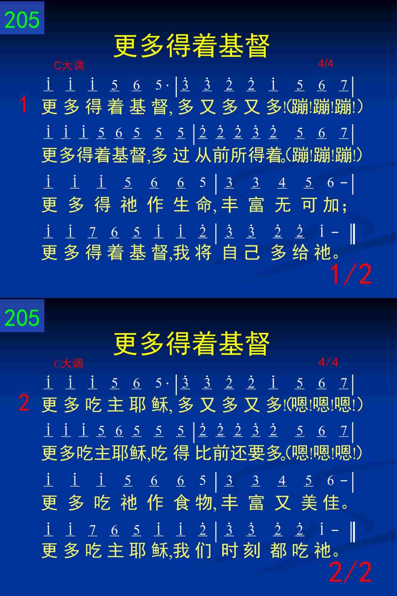 更多得着基督,多又多又多!更多得着基督,多过从前所得着。更多得祂作生命,丰富无可加;更多得着基督,我将自己多给祂。