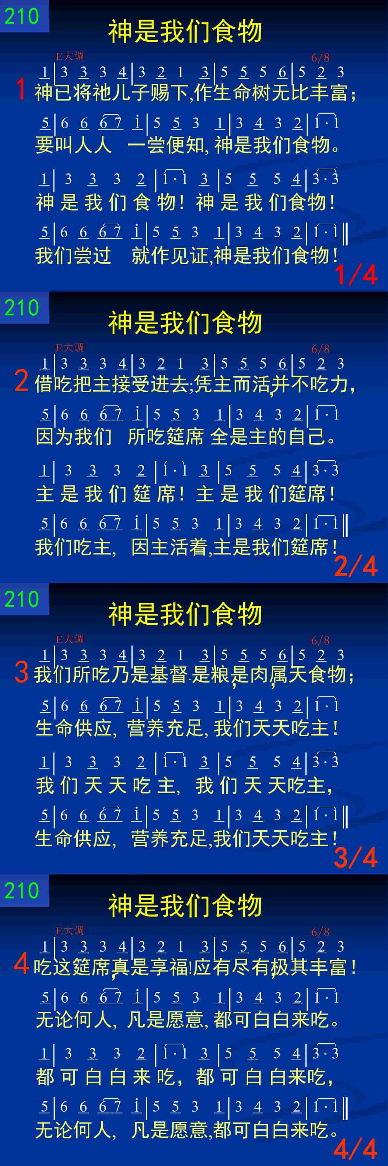 我们所吃乃是基督——是粮,是肉,属天食物;生命供应,营养充足,我们天天吃主!我们天天吃主,我们天天吃主,生命供应,营养充足,我们天天吃主!