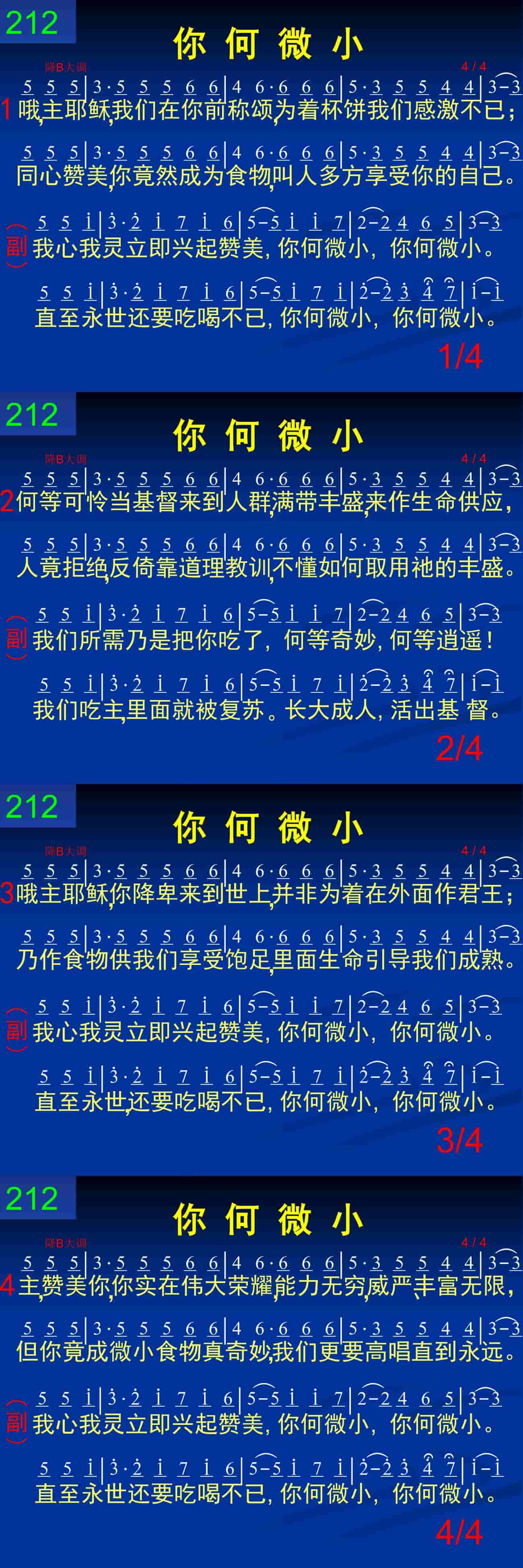 我心我灵立即兴起赞美,你何微小,你何微小。直至永世还要吃喝不已,你何微小,你何微小。