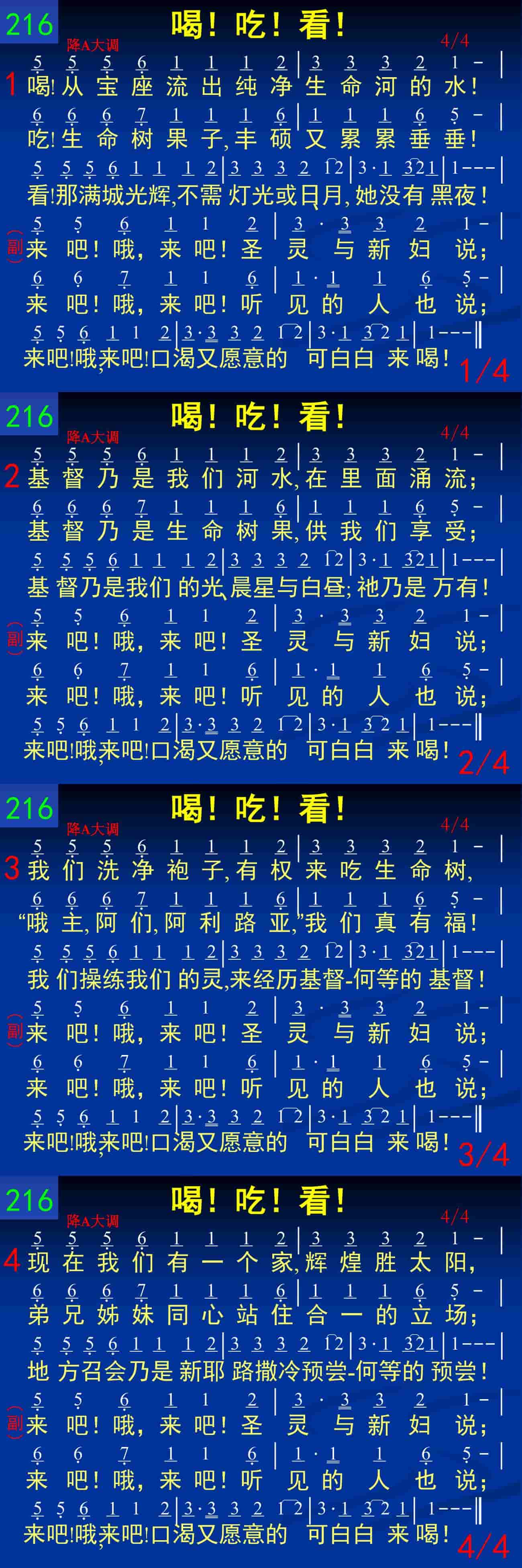来吧!哦,来吧!圣灵与新妇说;来吧!哦,来吧!听见的人也说;来吧!哦,来吧!口渴又愿意的可白白来喝!