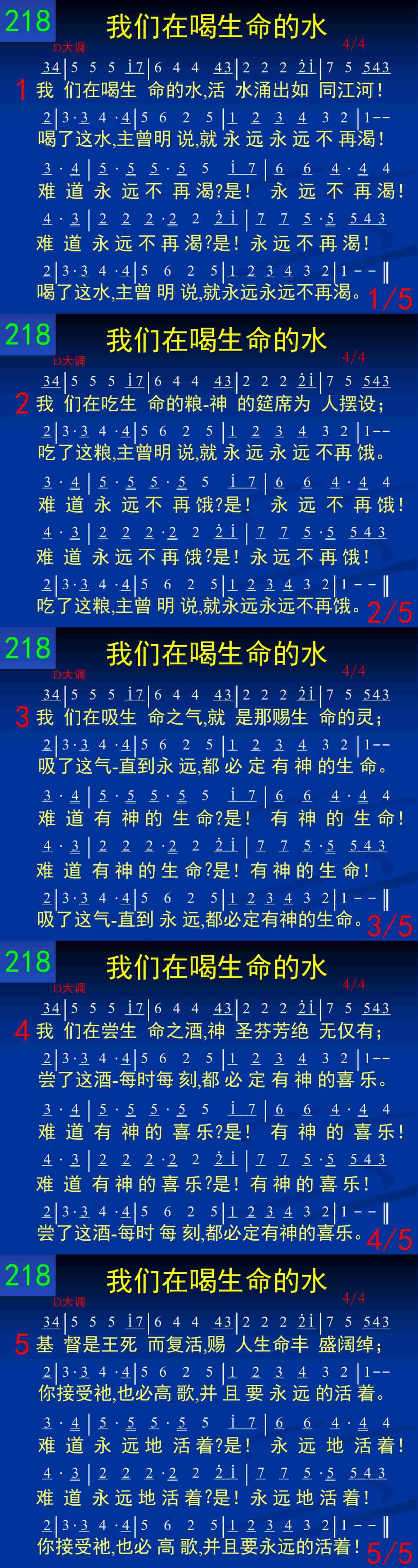 我们在喝生命的水,活水涌出如同江河!喝了这水,主曾明说,就永远永远不再渴!难道永远不再渴?是!永远不再渴!难道永远不再渴?是!永远不再渴!喝了这水,主曾明说,就永远永远不再渴。