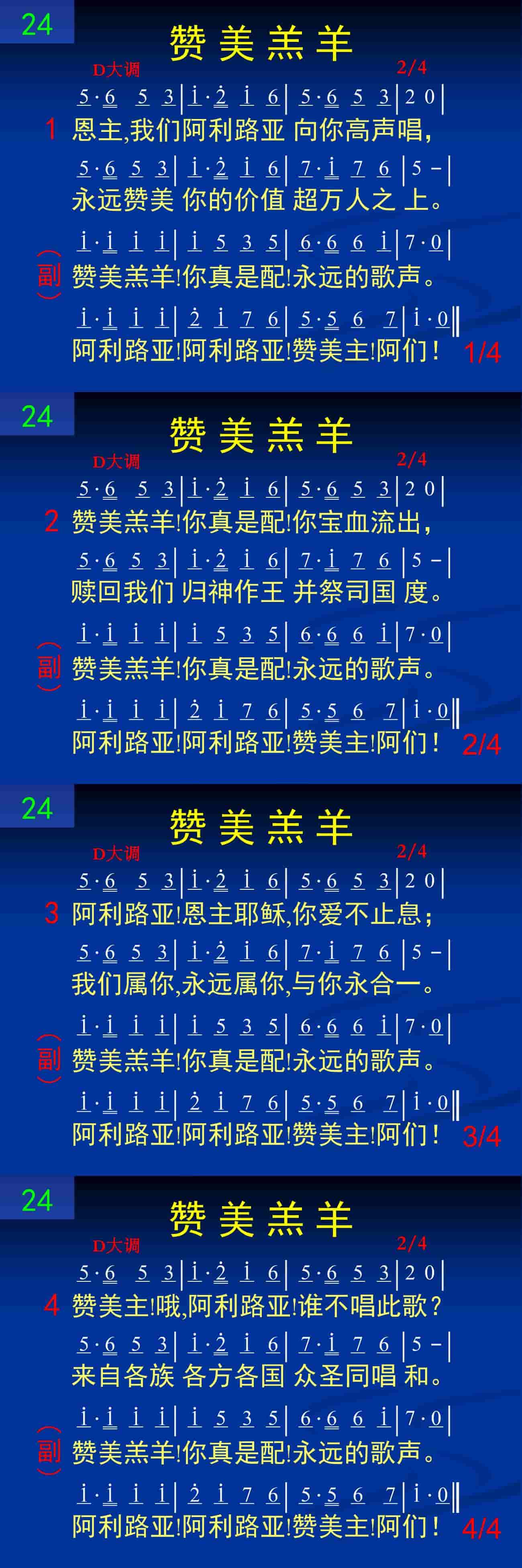 赞美羔羊!你真是配!永远的歌声。阿利路亚!阿利路亚!赞美主!阿们!