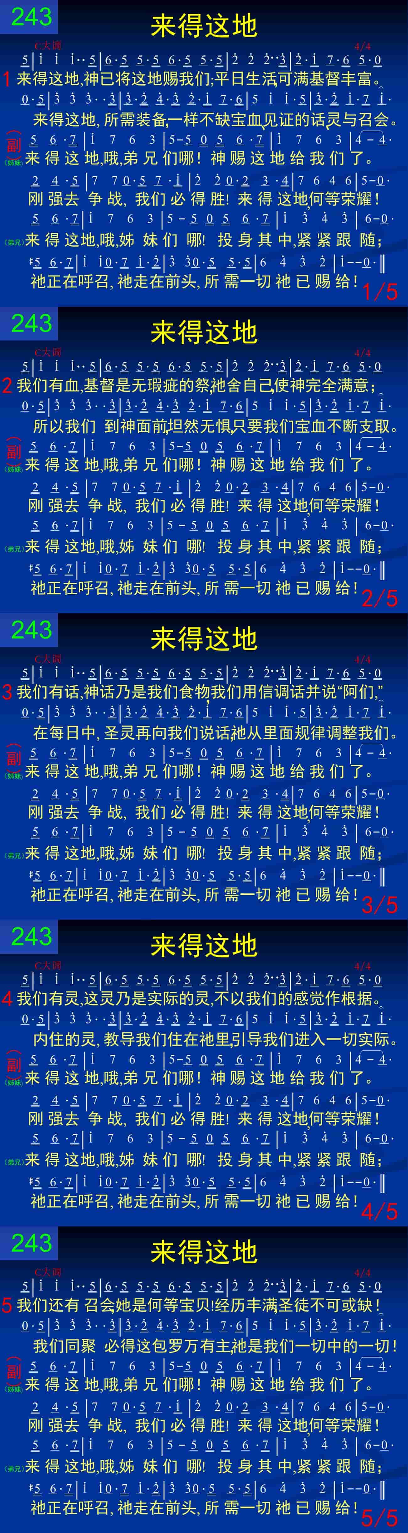 来得这地,神已将这地赐我们;平日生活,可满基督丰富。来得这地,所需装备,一样不缺——宝血、见证的话、灵与召会。