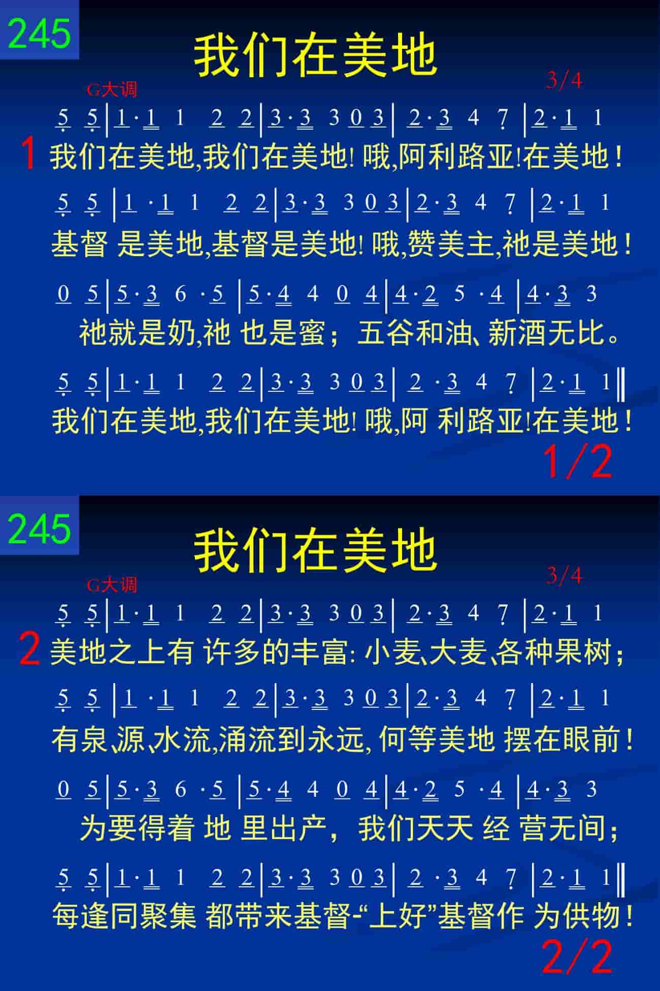 我们在美地,我们在美地!哦,阿利路亚!在美地!基督是美地,基督是美地!哦,赞美主,祂是美地!祂就是奶,祂也是蜜;五谷和油、新酒无比。我们在美地,我们在美地!哦,阿利路亚!在美地!