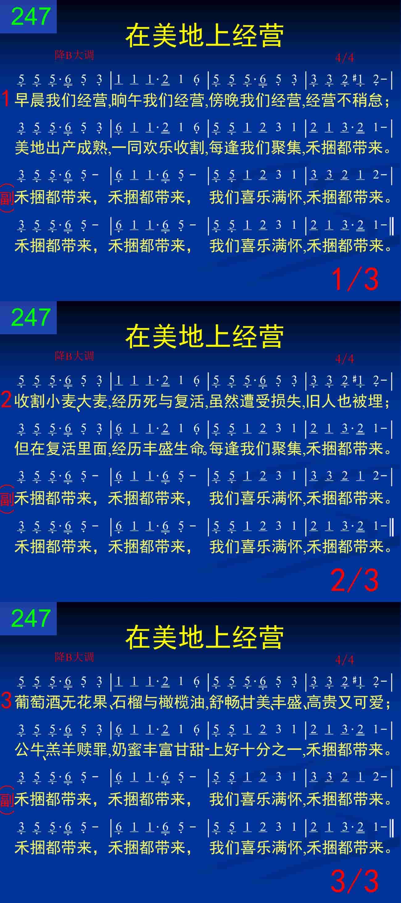 早晨我们经营,晌午我们经营,傍晚我们经营,经营不稍怠;美地出产成熟,一同欢乐收割,每逢我们聚集,禾捆都带来。