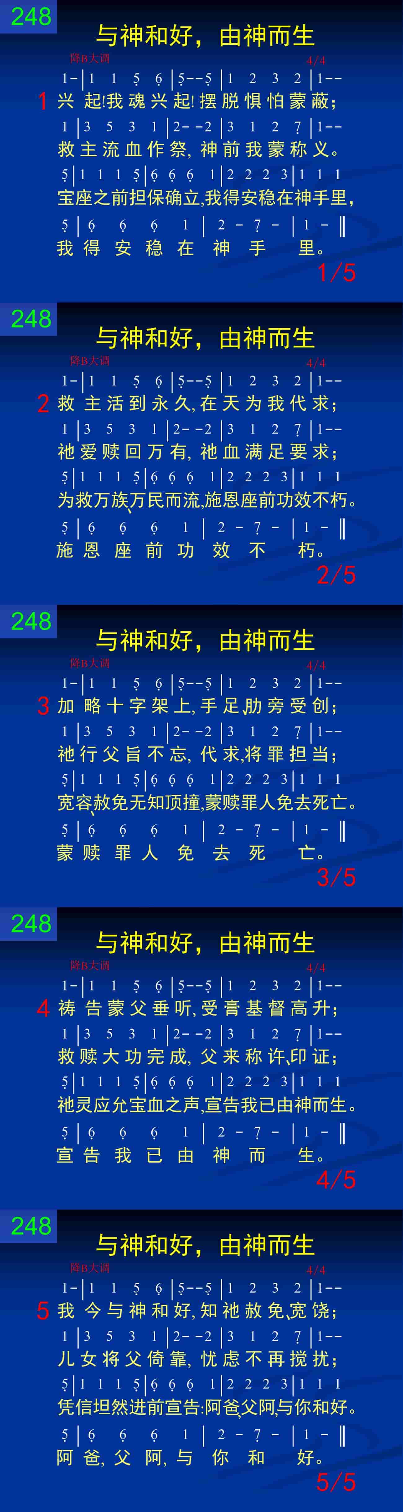 我今与神和好,知祂赦免、宽饶;儿女将父倚靠,忧虑不再搅扰;凭信坦然进前宣告:阿爸,父啊,与你和好。