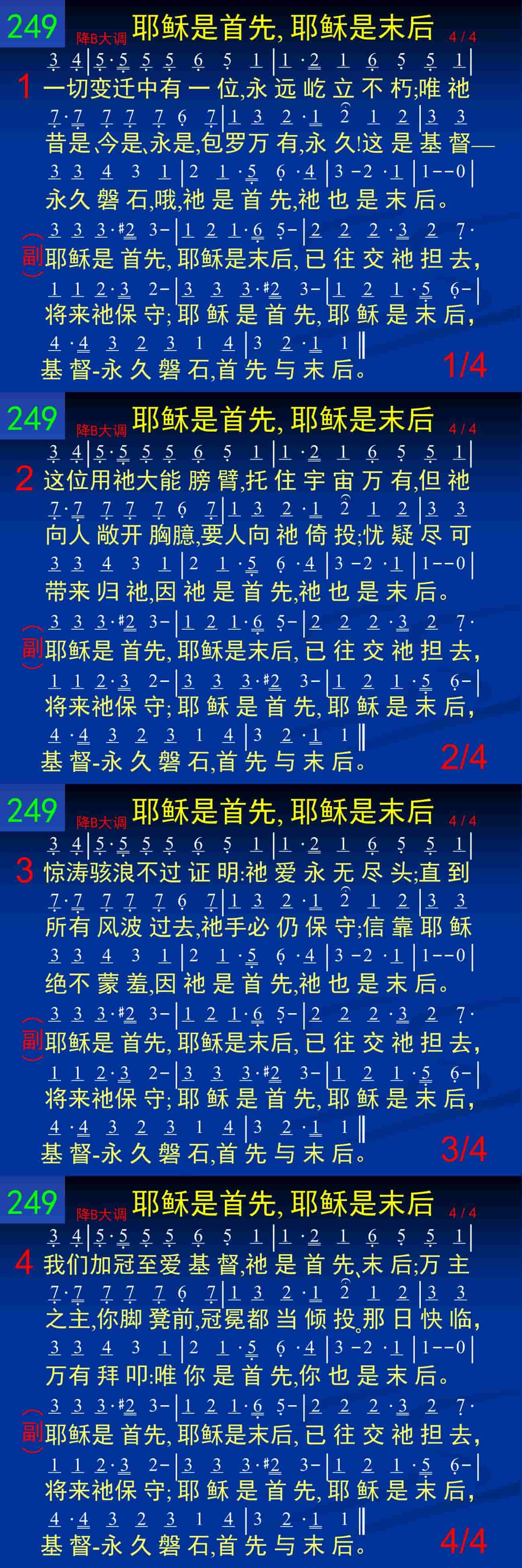 耶稣是首先,耶稣是末后,已往交祂担去,将来祂保守;耶稣是首先,耶稣是末后,基督——永久盘石,首先与末后。