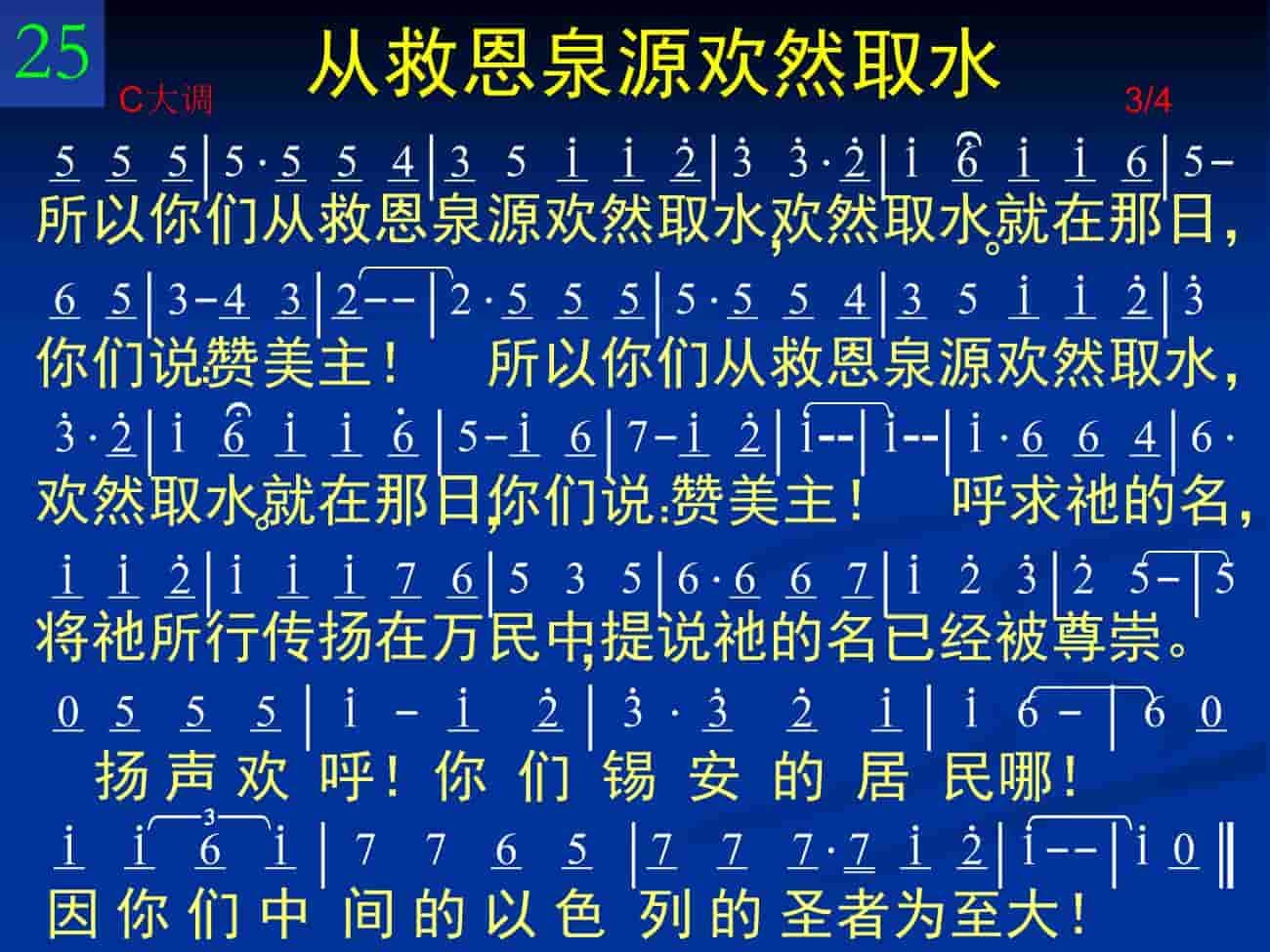 所以你们从救恩泉源欢然取水,欢然取水。就在那日,你们说:赞美主!所以你们从救恩泉源欢然取水,欢然取水。就在那日,你们说:赞美主!呼求祂的名,将祂所行传扬在万民中,题说祂的名已经被尊崇。扬声欢呼!你们锡安的居民哪!因你们中间的以色列的圣者为至大!