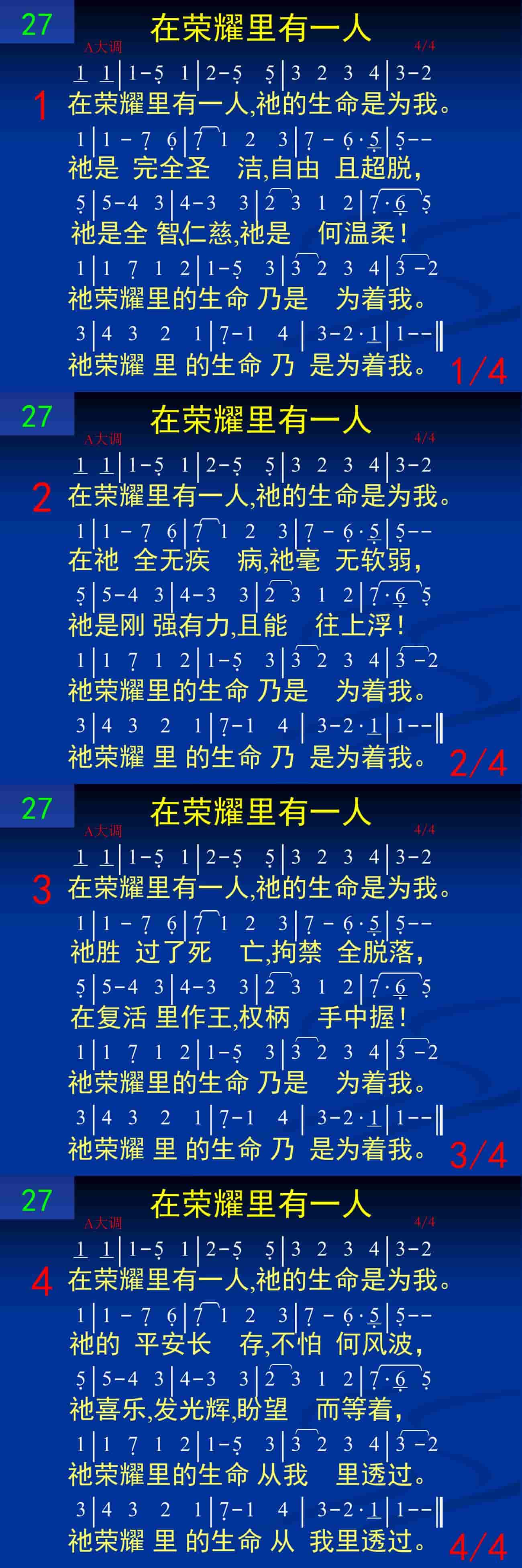 在荣耀里有一人,祂的生命是为我。祂的平安长存,不怕何风波,祂喜乐,发光辉,盼望而等着,祂荣耀里的生命从我里透过。祂荣耀里的生命从我里透过。