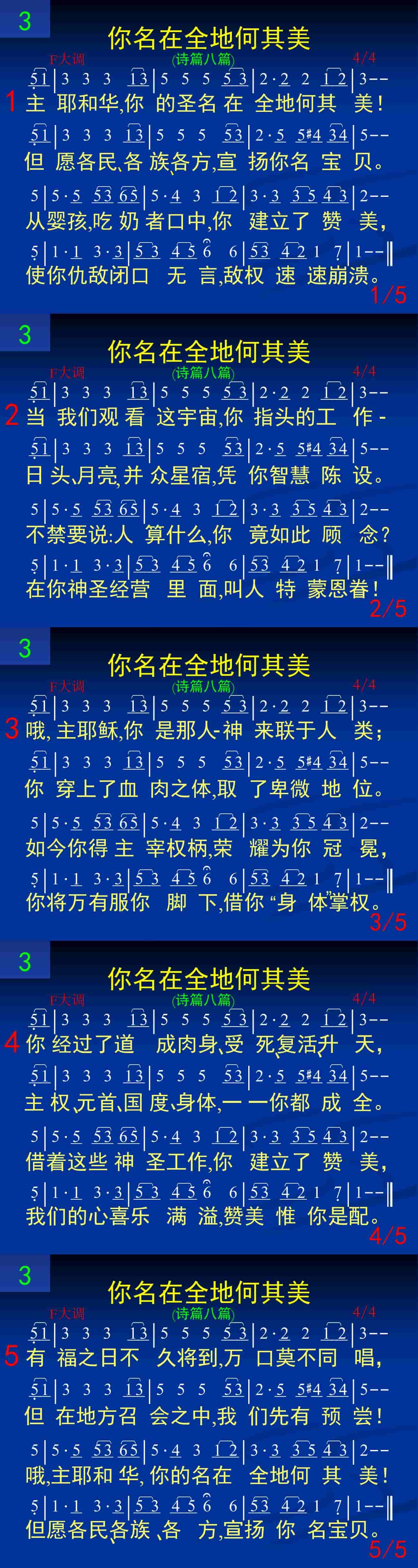 主耶和华,你的圣名在全地何其美!但愿各民、各族、各方,宣扬你名宝贝。从婴孩,吃奶者口中,你建立了赞美,使你仇敌闭口无言,敌权速速崩溃。