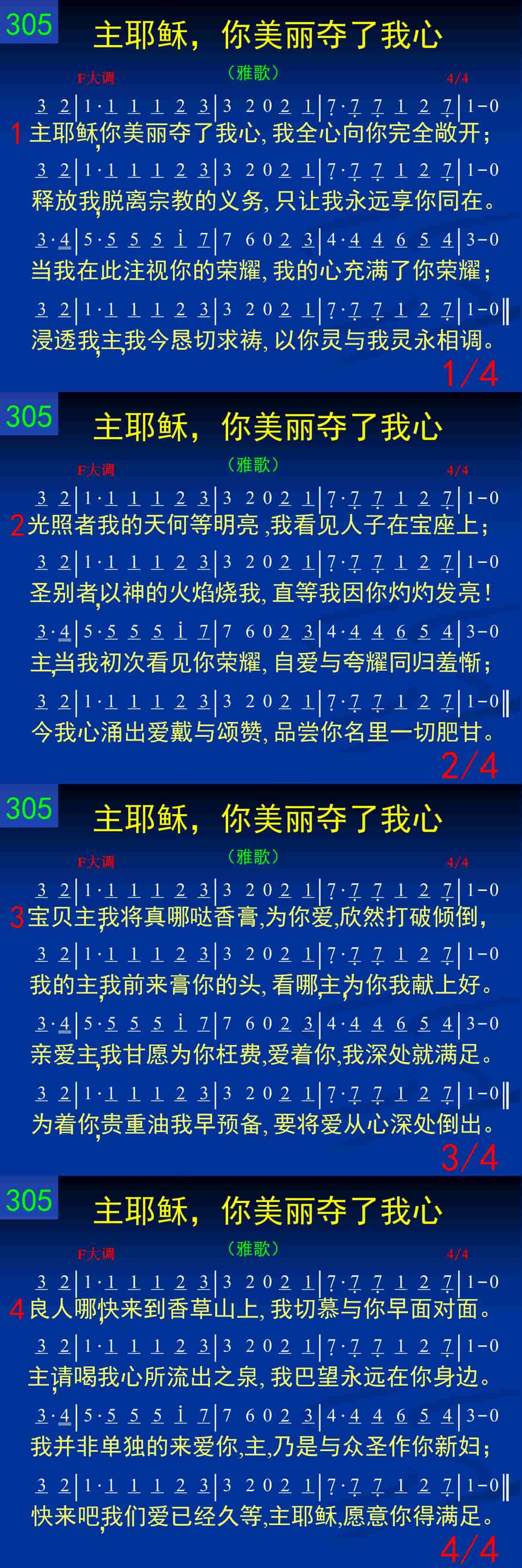 良人哪,快来到香草山上,我切慕与你早面对面。主,请喝我心所流出之泉,我巴望永远在你身边。我并非单独的来爱你,主,乃是与众圣作你新妇;快来吧,我们爱已经久等,主耶稣,愿意你得满足。