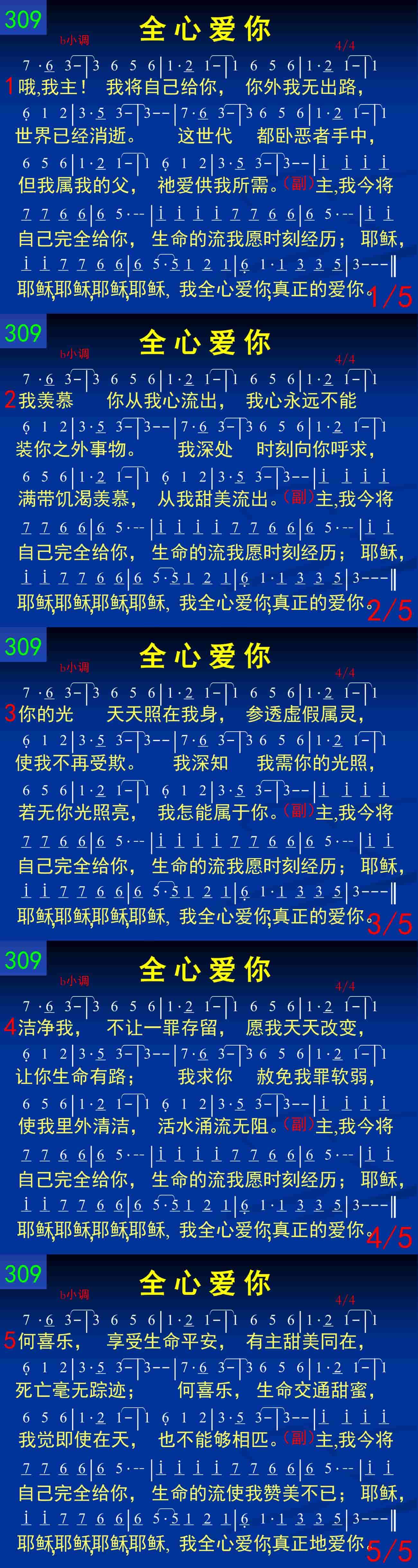 主,我今将自己完全给你,生命的流使我赞美不已;耶稣,耶稣,耶稣,耶稣,耶稣,我全心爱你,真正的爱你。