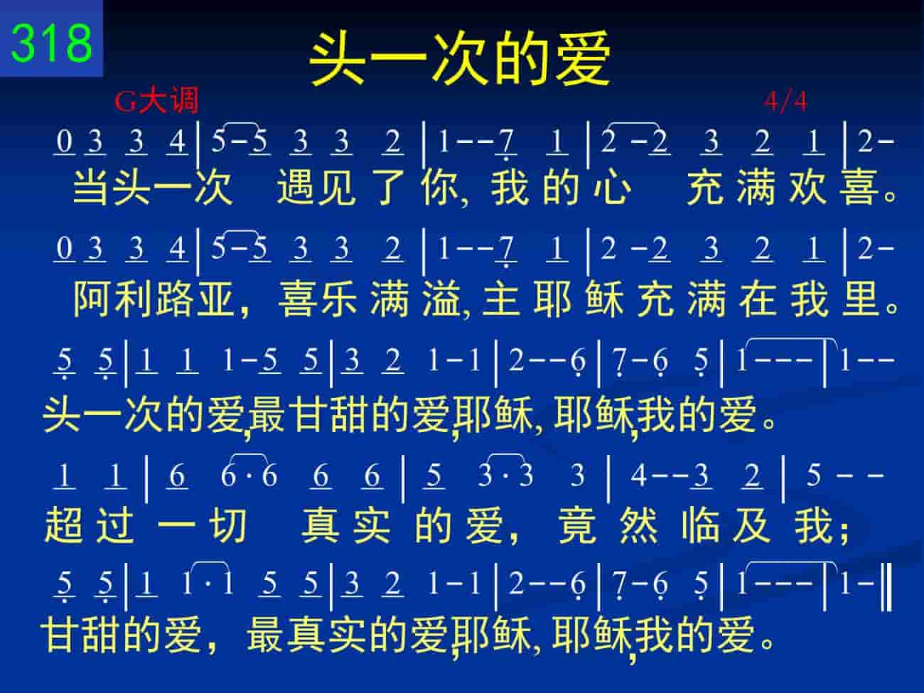 当头一次遇见了你,我的心充满欢喜。阿利路亚,喜乐满溢,主耶稣充满在我里。头一次的爱,最甘甜的爱,耶稣,耶稣,我的爱。超过一切真实的爱,竟然临及我;甘甜的爱,最真实的爱,耶稣,耶稣,我的爱。