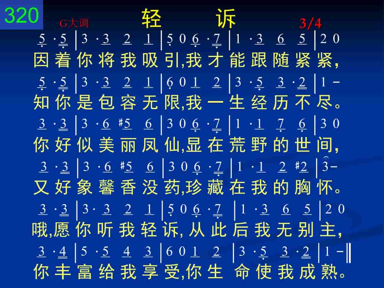 因着你将我吸引,我才能跟随紧紧,知你是包容无限,我一生经历不尽。你好似美丽凤仙,显在荒野的世间,又好像馨香没药,珍藏在我的胸怀。哦,愿你听我轻诉,从此后我无别主,你丰富给我享受,你生命使我成熟。