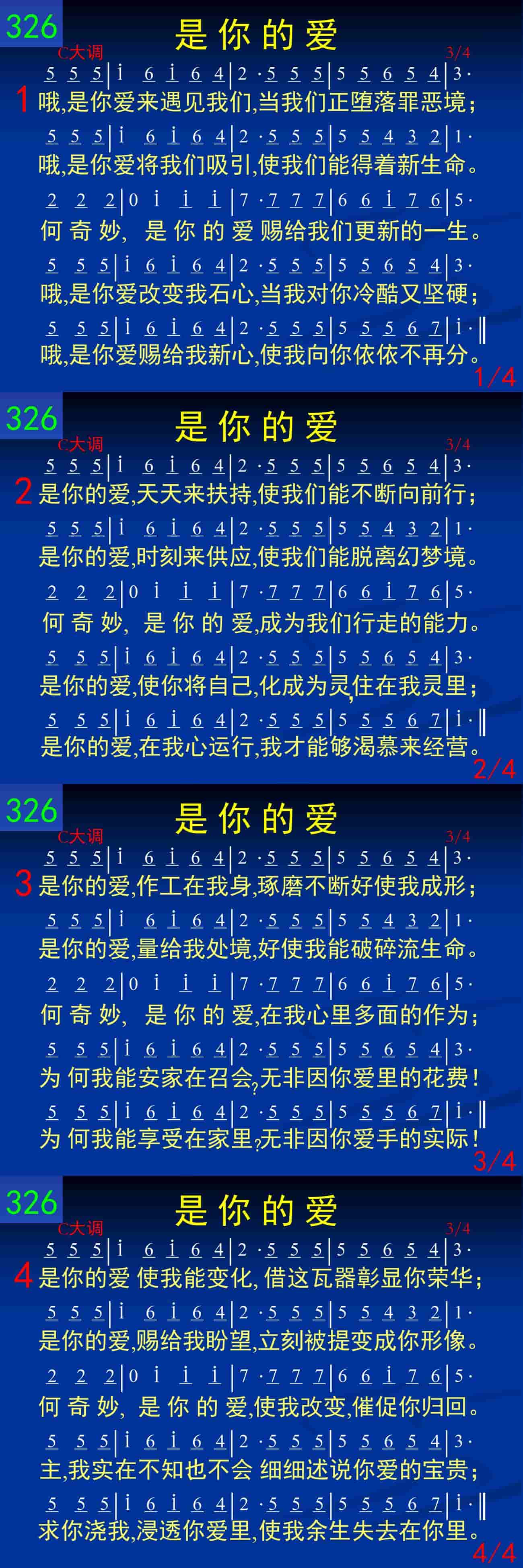 是你的爱,天天来扶持,使我们能不断向前行;是你的爱,时刻来供应,使我们能脱离幻梦境。何奇妙,是你的爱,成为我们行走的能力。是你的爱,使你将自己,化成为灵,住在我灵里;是你的爱,在我心运行,我才能够渴慕来经营。