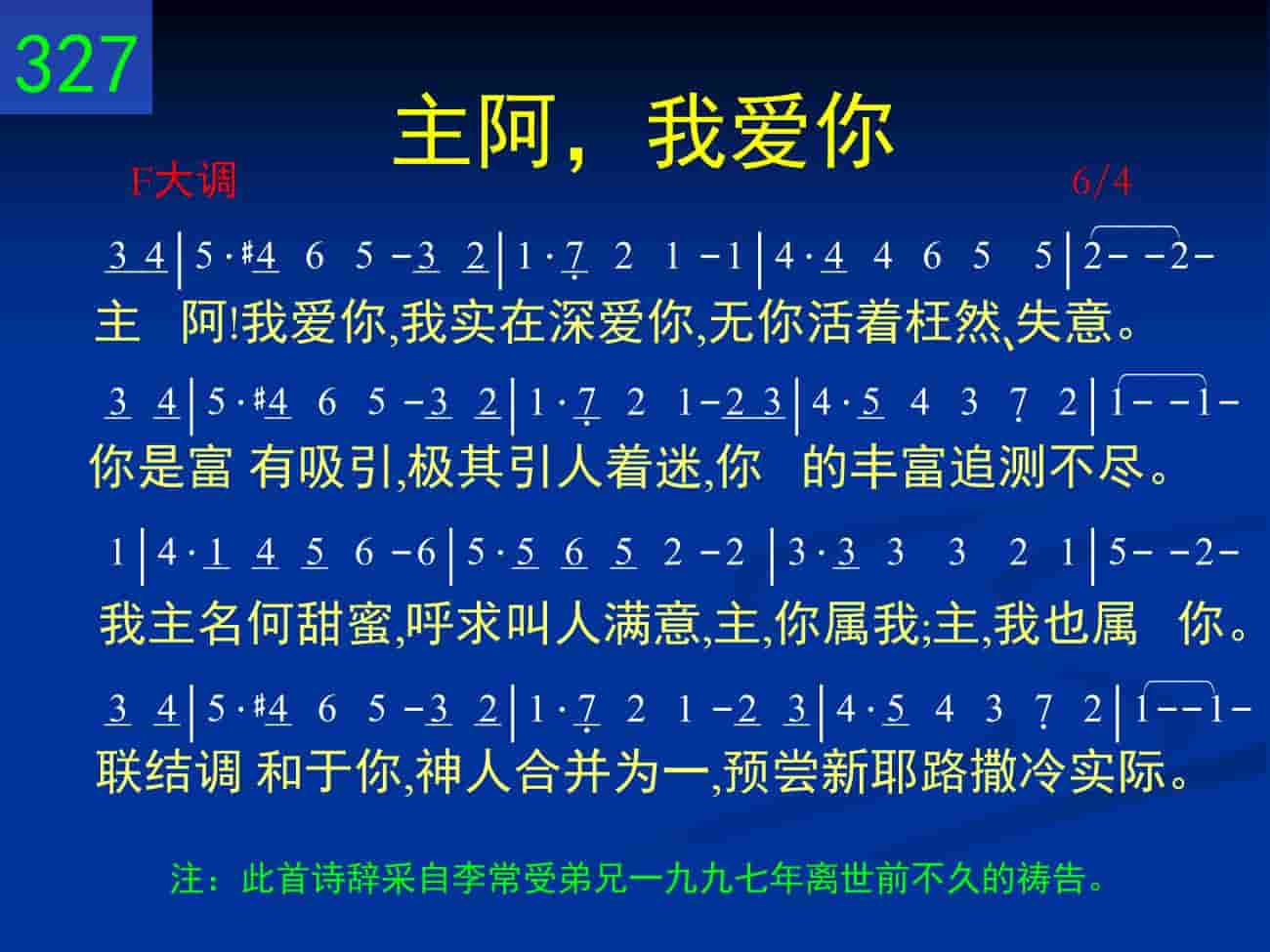 主啊!我爱你,我实在深爱你,无你活着枉然、失意。你是富有吸引,极其引人着迷,你的丰富追测不尽。我主名何甜蜜,呼求叫人满意,主,你属我;主,我也属你。联结调和于你,神人合并为一,预尝新耶路撒冷实际。