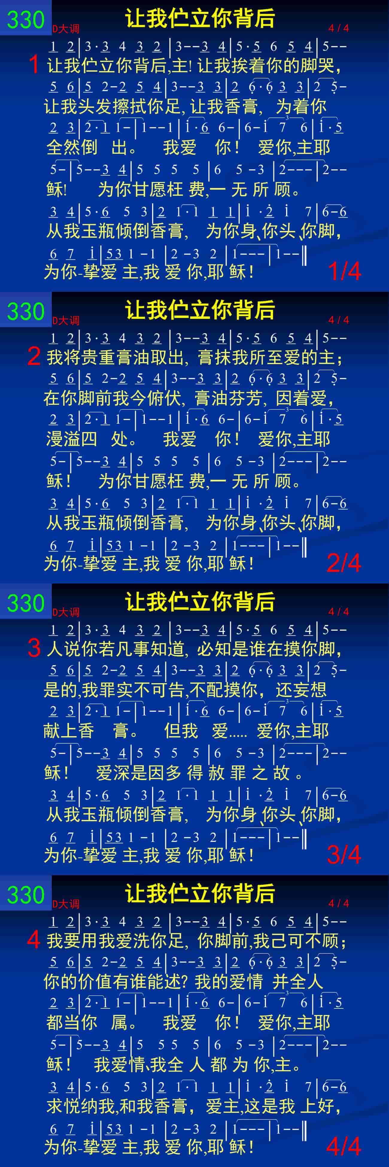 让我伫立你背后,主!让我挨着你的脚哭,让我头发擦拭你足,让我香膏,为着你全然倒出。我爱你!爱你,主耶稣!为你甘愿枉费,一无所顾。从我玉瓶倾倒香膏,为你身、你头、你脚,为你——挚爱主,我爱你,耶稣!