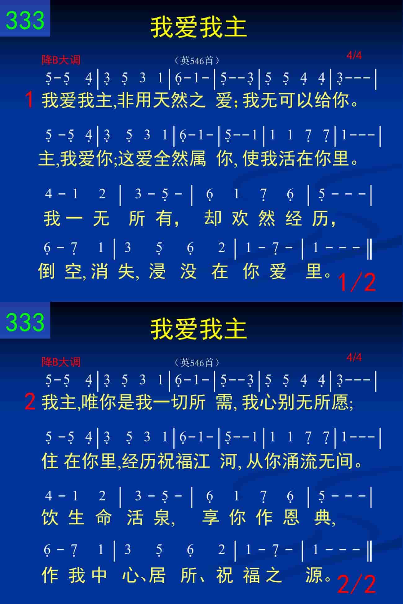 我爱我主,非用天然之爱;我无可以给你。主,我爱你;这爱全然属你,使我活在你里。我一无所有,却欢然经历,倒空,消失,浸没在你爱里。