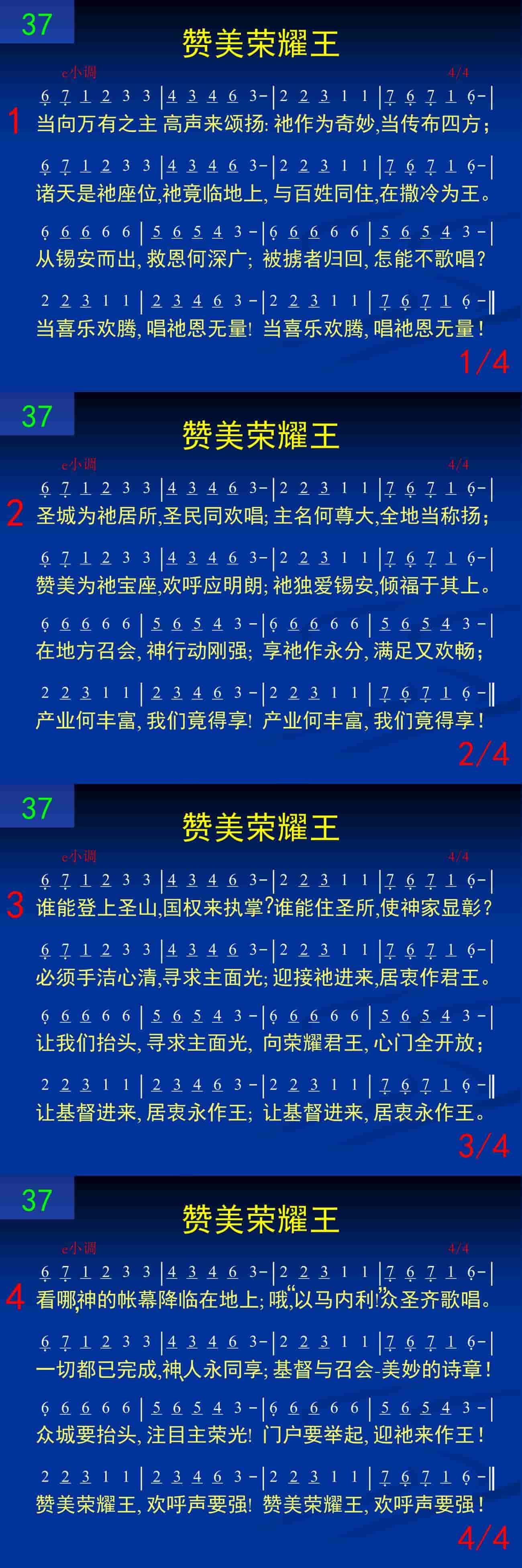 当向万有之主高声来颂扬:祂作为奇妙,当传布四方;诸天是祂座位,祖竟临地上,与百姓同住,在撒冷为王。从锡安而出,救恩何深广;被掳者归回,怎能不歌唱?当喜乐欢腾,唱祂恩无量!当喜乐欢腾,唱祂恩无量!