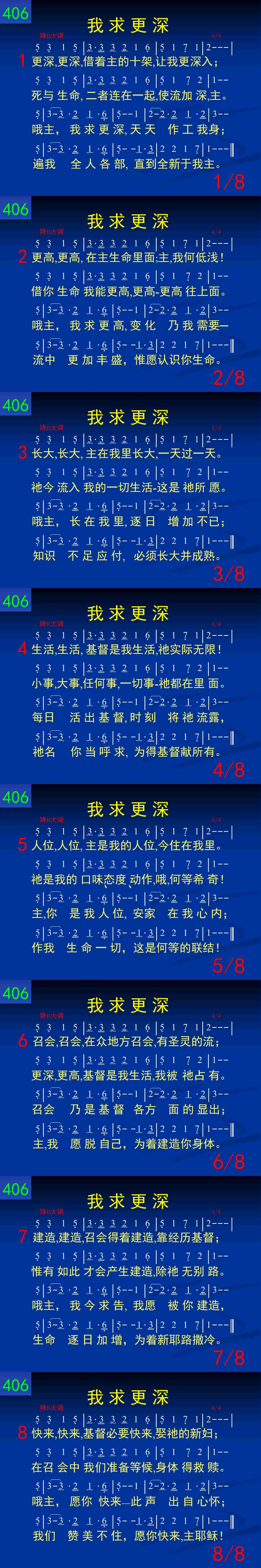 更深,更深,借着主的十架,让我更深入;死与生命,二者连在一起,使流加深,主。哦主,我求更深,天天作工我身;遍我全人各部,直到全新于我主。