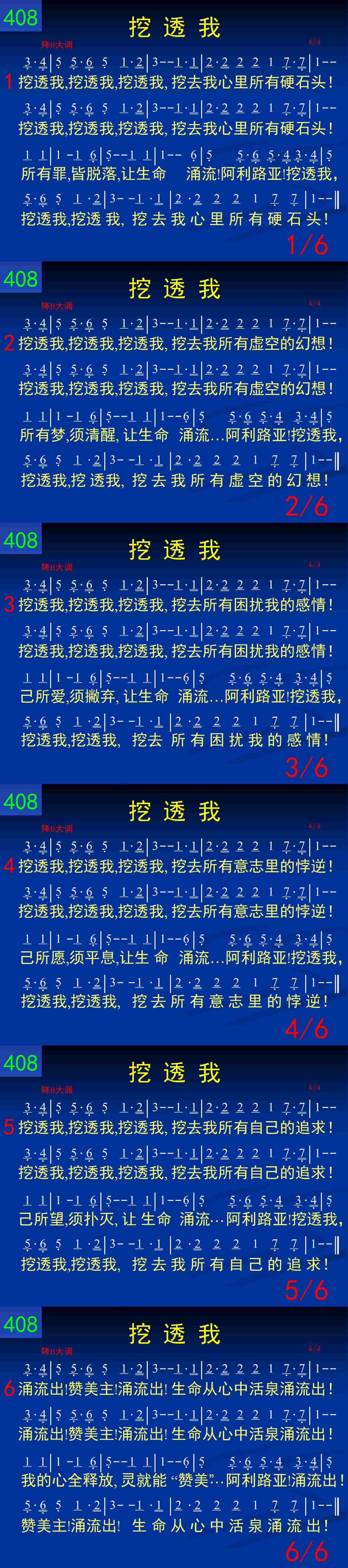 挖透我,挖透我,挖透我,挖去我心里所有硬石头!所有罪,皆脱落,让生命涌流!阿利路亚!挖透我,挖透我,挖透我,挖去我心里所有硬石头!