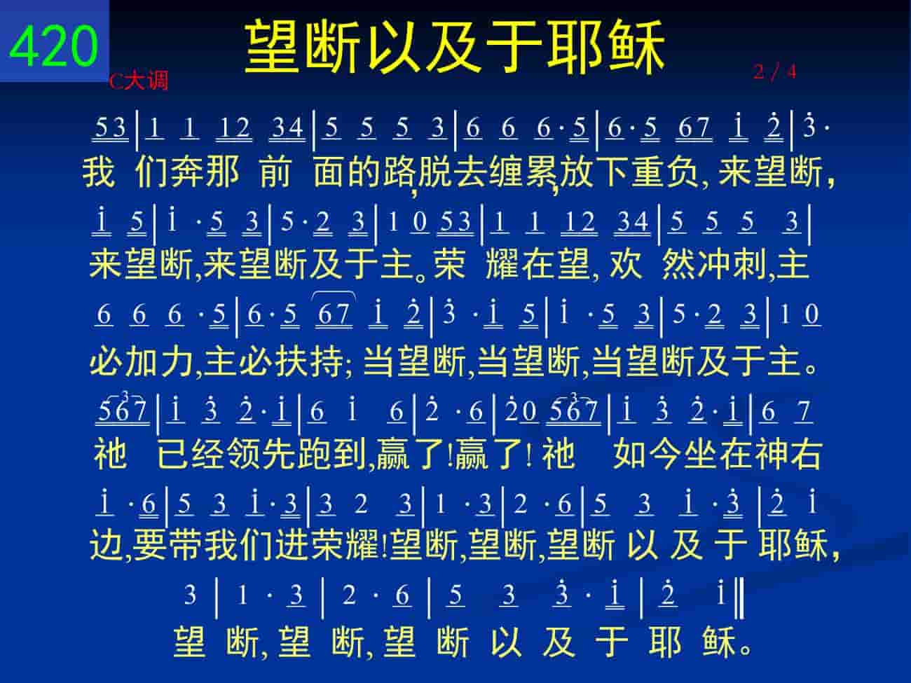 我们奔那前面的路,脱去缠累,放下重负,来望断,来望断,来望断及于主。荣耀在望,欢然冲刺,主必加力,主必扶持;当望断,当望断,当望断及于主。祂已经领先跑到,赢了!赢了!祂如今坐在神右边,要带我们进荣耀!望断,望断,望断以及于耶稣,望断,望断,望断以及于耶稣。