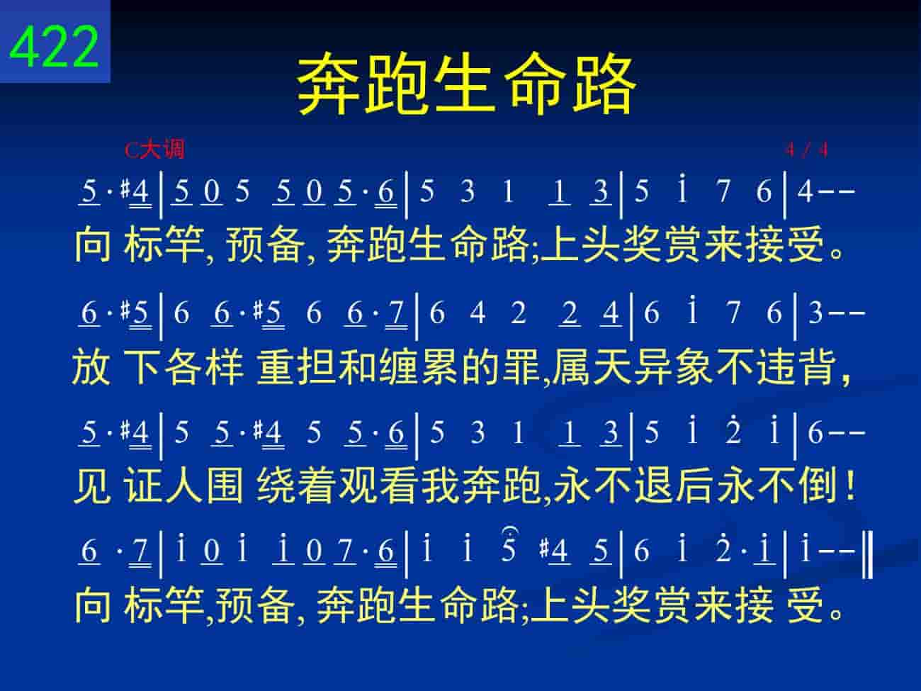 向标竿,预备,奔跑生命路;上头奖赏来接受。放下各样重担和缠累的罪,属天异象不违背,见证人围绕着观看我奔跑,永不退后永不倒!向标竿,预备,奔跑生命路;上头奖赏来接受。