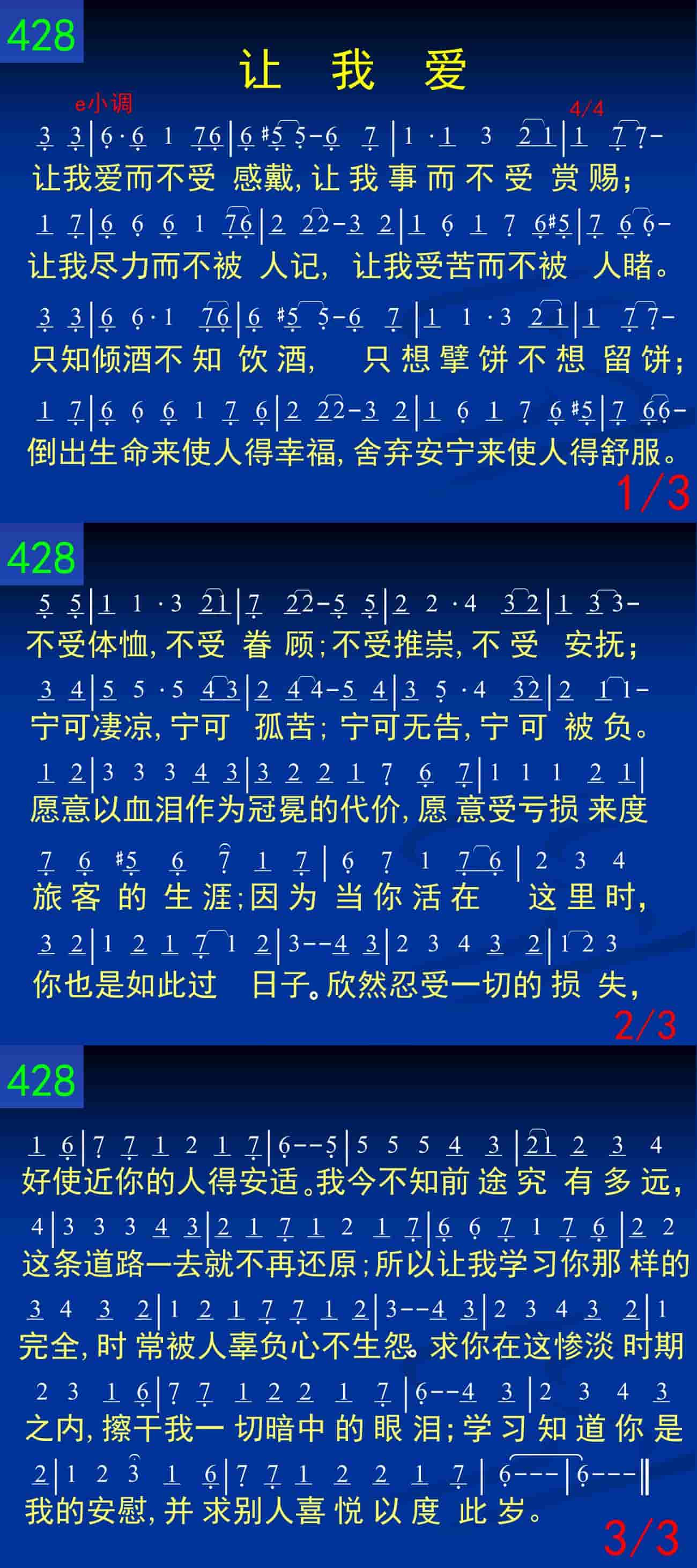 让我爱而不受感戴,让我事而不受赏赐;让我尽力而不被人记,让我受苦而不被人睹。只知倾酒不知饮酒,只想擘饼不想留饼;倒出生命来使人得幸福,舍弃安宁来使人得舒服。不受体恤,不受眷顾;不受推崇,不受安抚;宁可凄凉,宁可孤苦;宁可无告,宁可被负。愿意以血泪作为冠冕的代价,愿意受亏损来度旅客的生涯;因为当你活在这里时,你也是如此过日子。欣然忍受一切的损失,好使近你的人得安适。我今不知前途究竟有多远,这条道路一去就不再还原;所以让我学习你那样的完全,时常被人辜负心不生怨。求你在这惨淡时期之内,擦干我一切暗中的眼泪。学习知道你是我的安慰,并求别人喜悦以度此岁。