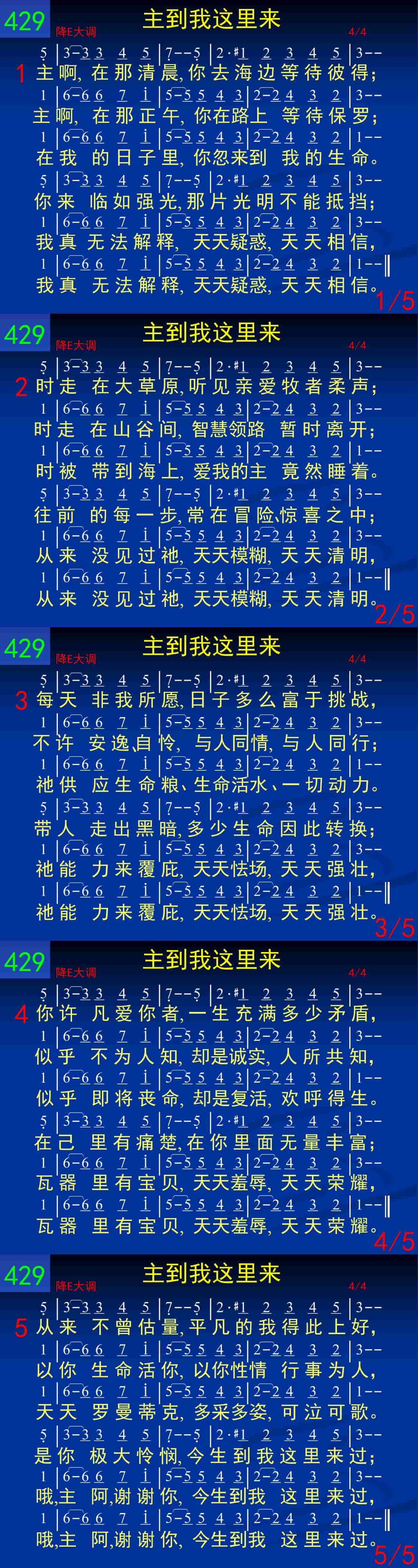 主啊,在那清晨,你去海边等待彼得;主啊,在那正午,你在路上等待保罗;在我的日子里,你忽来到我的生命。你来临如强光,那片光明不能抵挡;我真无法解释,天天疑惑,天天相信,我真无法解释,天天疑惑,天天相信。