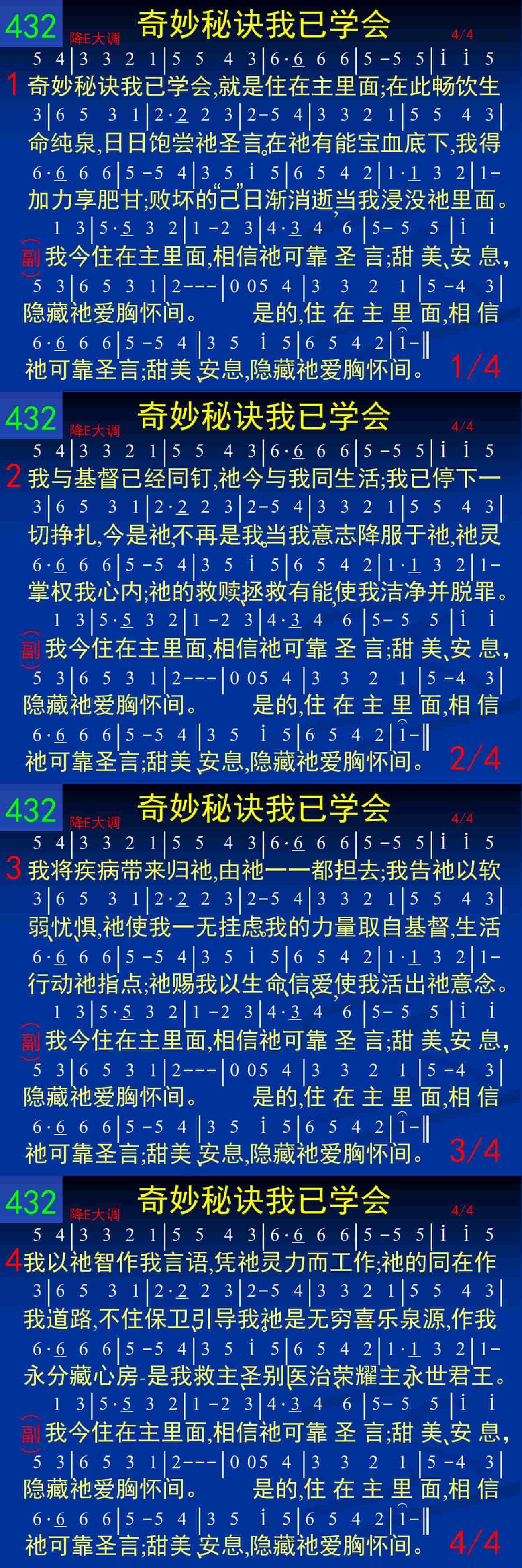 奇妙秘诀我已学会,就是住在主里面;在此畅饮生命纯泉,日日饱尝祂圣言。在祂有能宝血底下,我得加力享肥甘;败坏的“己”日渐消逝,当我浸没祂里面。