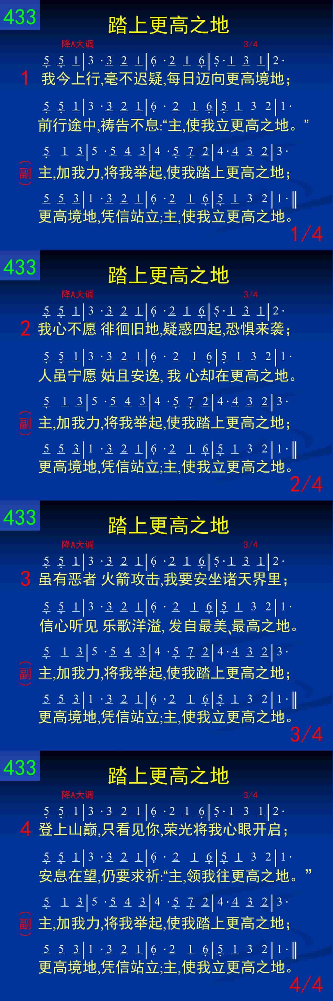 主,加我力,将我举起,使我踏上更高之地;更高境地,凭信站立;主,使我立更高之地。