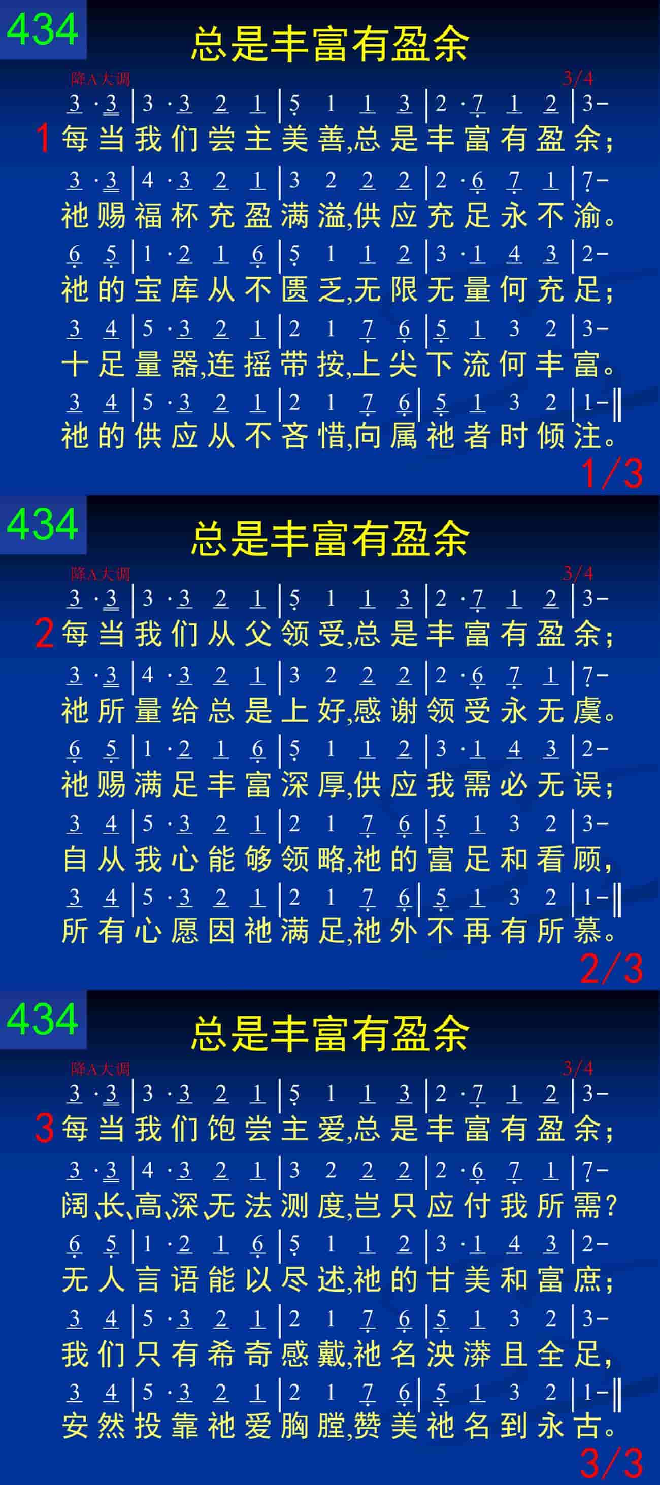 每当我们尝主美善,总是丰富有盈余;祂赐福杯充盈满溢,供应充足永不渝。祂的宝库从不匮乏,无限无量何充足;十足量器,连摇带按,上尖下流何丰富。祂的供应从不吝惜,向属祂者时倾注。