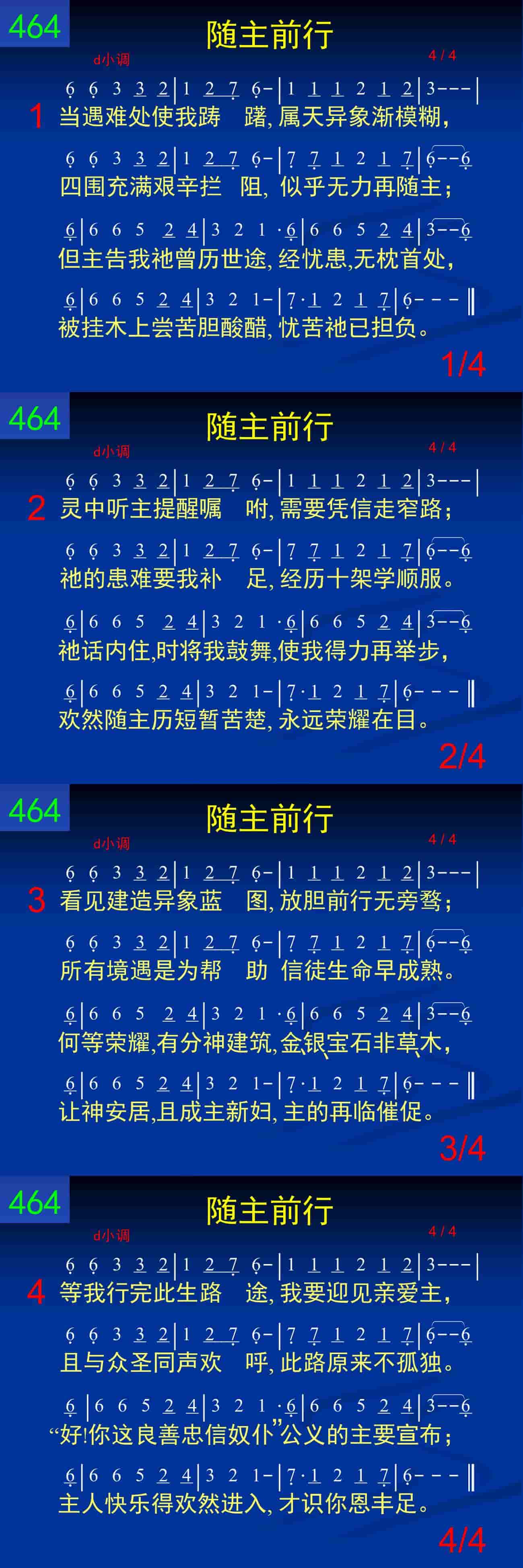 灵中听主提醒嘱咐,需要凭信走窄路;祂的患难要我补足,经历十架学顺服。祂话内住,时将我鼓舞,使我得力再举步,欢然随主历短暂苦楚,永远荣耀在目。