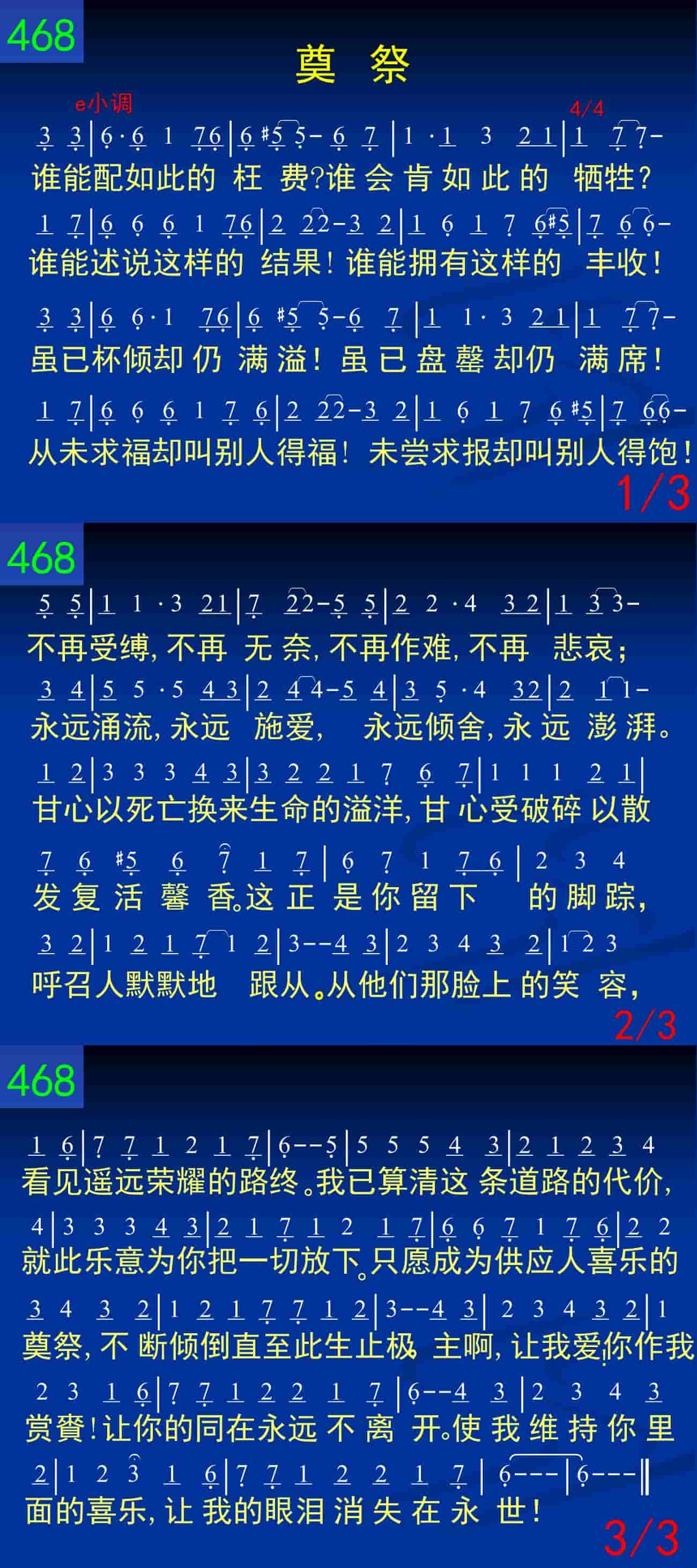 谁能配得如此的枉费?谁会肯如此的牺牲?谁能述说这样的结果!谁能拥有这样的丰收!虽已杯倾却仍满溢!虽已盘罄却仍满席!从未求福却叫别人得福!未尝求报却叫别人得饱!不再受缚,不再无奈,不再作难,不再悲哀;永远涌流,永远施爱,永远倾舍,永远澎湃。甘心以死亡换来生命的溢洋,甘心受破碎以散发发复活馨香。这正是你留下的脚踪,呼召人默默的跟从。从他们那脸上的笑容,看见遥远荣耀的路终。我已算清这条道路的代价,就此乐意为你把一切放下。只愿成为供人喜乐的奠祭,不断倾倒直至此生止极。主啊,让我爱!求你做我赏莱!让你的同在永远不离开。使我维持里面的喜乐,让我的眼泪消失在永世。