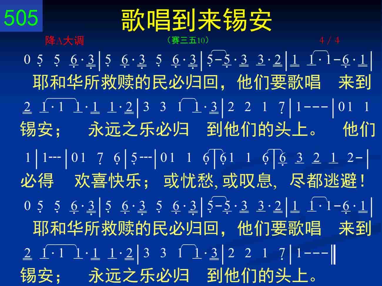 耶和华所救赎的民必归回,他们要歌唱来到锡安;永远之乐必归到他们的头上。他们必得欢喜快乐;或忧愁,或叹息,尽都逃避!耶和华所救赎的民必归回,他们要歌唱来到锡安;永远之乐必归到他们的头上。