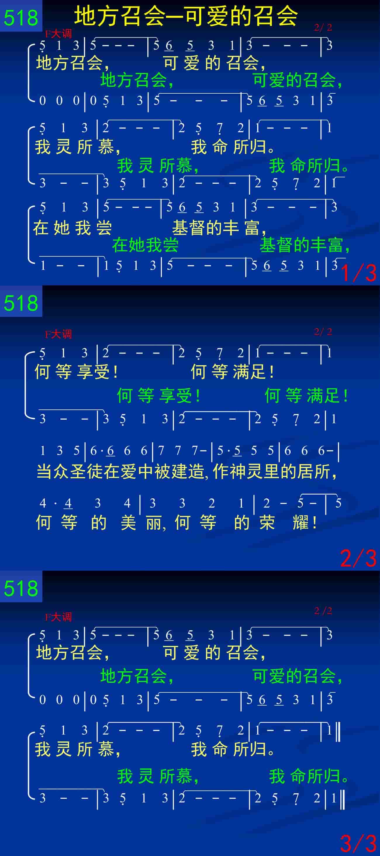 地方召会,可爱的召会,我灵所慕,我命所归。在祂我尝基督的丰富,何等享受!何等满足!当众圣徒在爱中被建造,作神灵里的居所,何等的美丽,何等的荣耀!地方召会,可爱的召会,我灵所慕,我命所归。