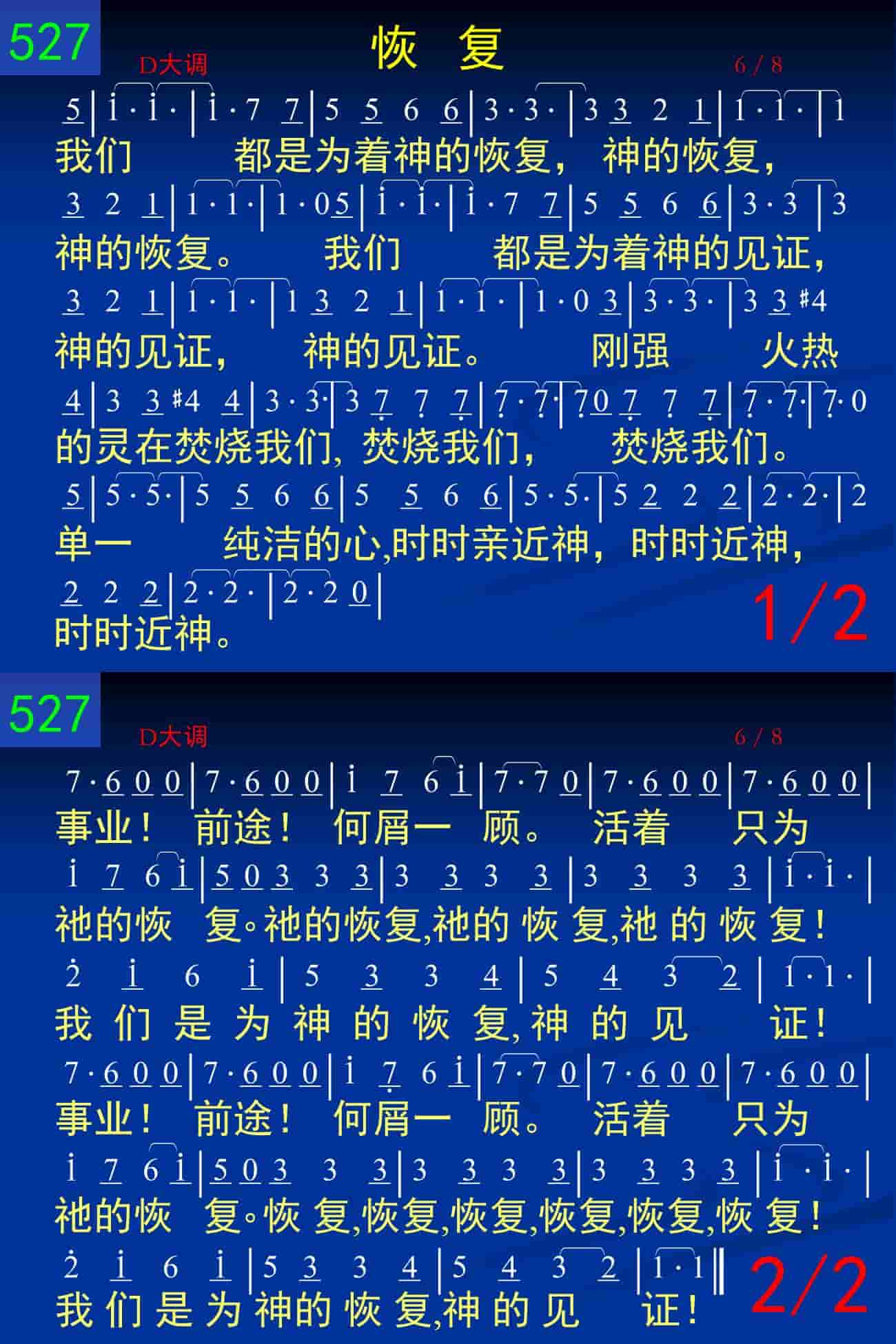 我们都是为着神的恢复,神的恢复,神的恢复。我们都是为着神的见证,神的见证,神的见证。刚强火热的灵在焚烧我们,焚烧我们,焚烧我们。单一纯洁的心,时时亲近神,时时近神,时时近神。事业!前途!何屑一顾。活着只为祂的恢复。祂的恢复,祂的恢复,祂的恢复!我们是为神的恢复,神的见证!事业!前途!何屑一顾。活着只为着祂的恢复。恢复,恢复,恢复,恢复,恢复,恢复!我们是为神的恢复,神的见证!