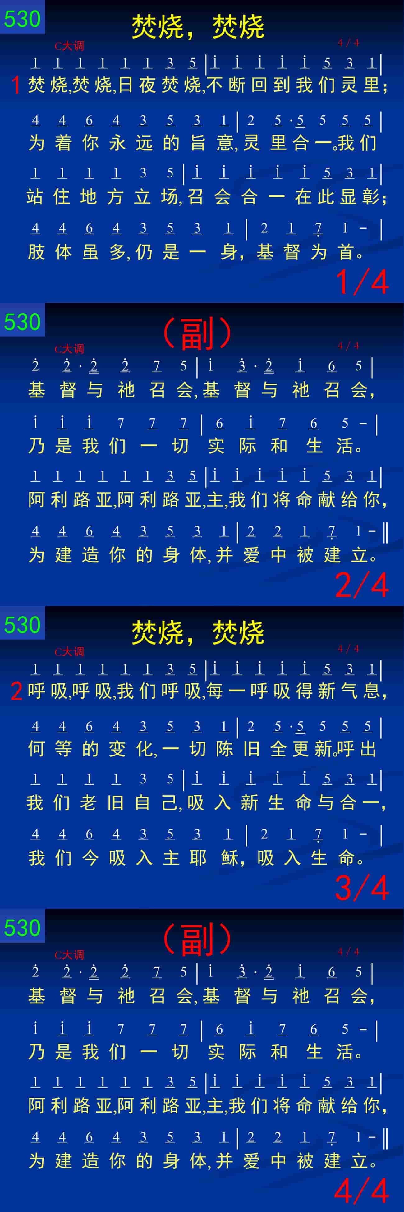 焚烧,焚烧,日夜焚烧,不断回到我们灵里;为着你永远的旨意,灵里合一。我们站住地方立场,召会合一在此显彰;肢体虽多,仍是一身,基督为首。